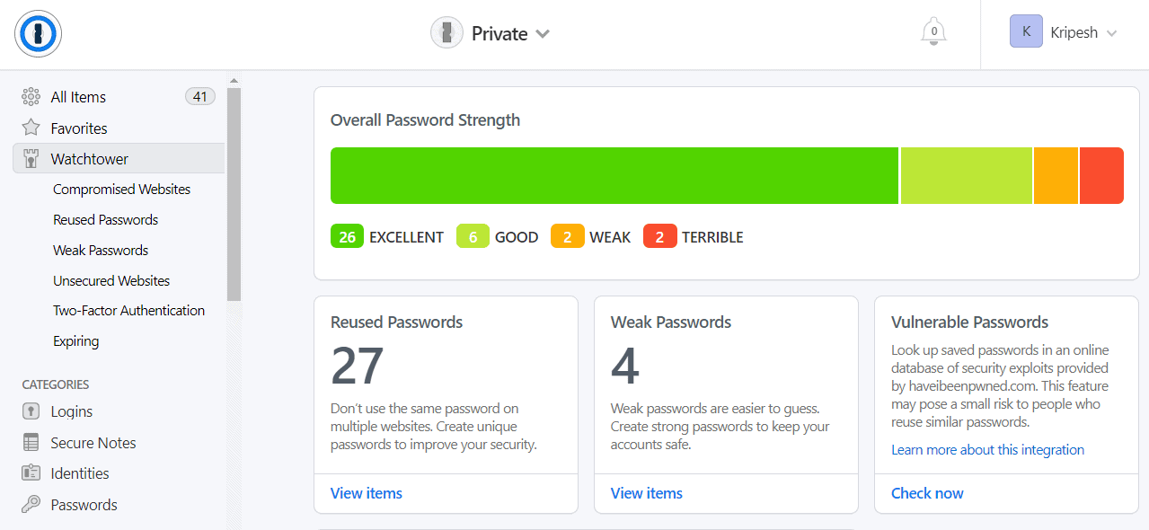 I was impressed with the Watchtower feature. It is the dark web monitoring tool of 1Password. It shows you details on: