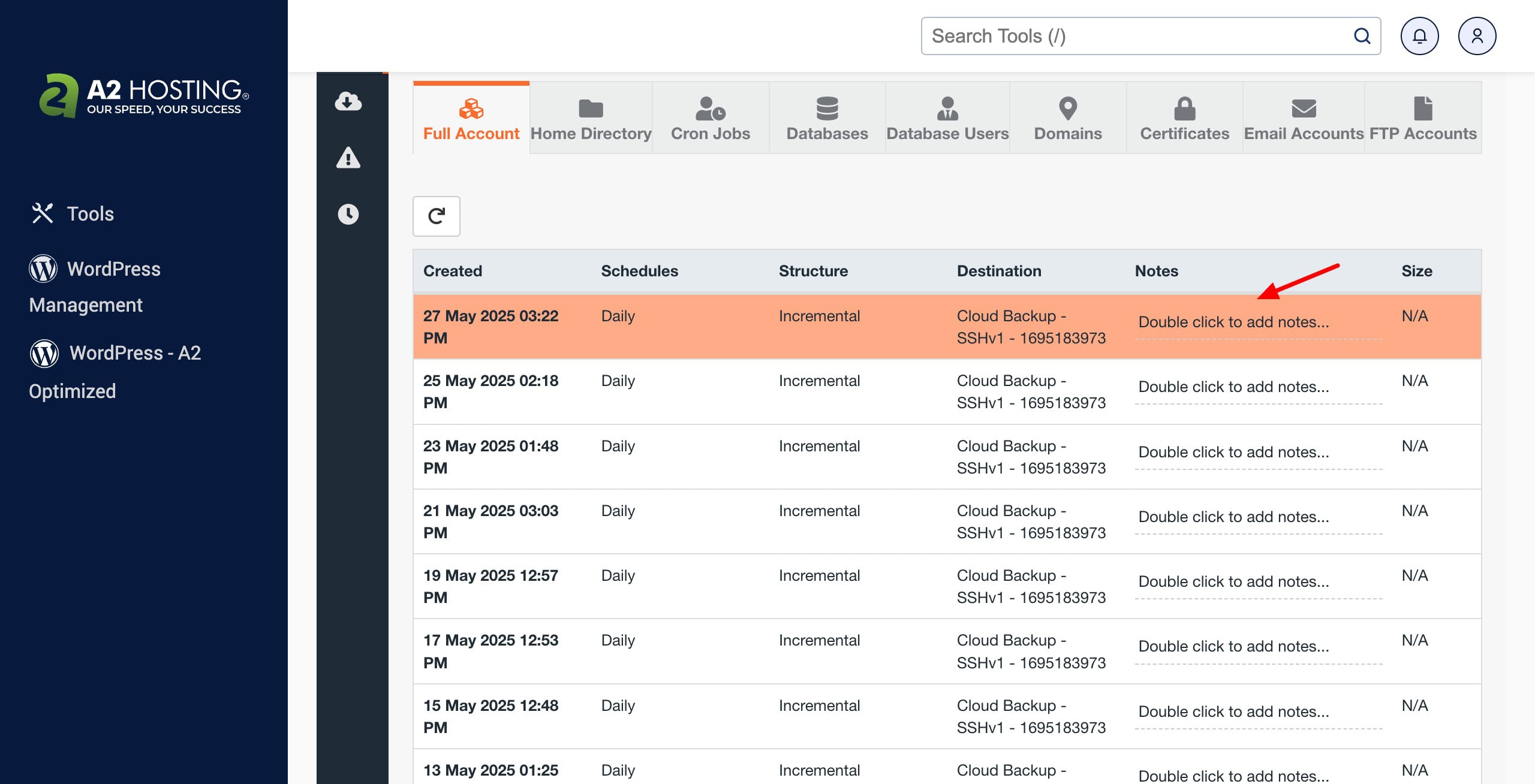 A2 Hosting creates automatic backups through its Server Rewind Backups service. These are stored on a separate server for 30 days.