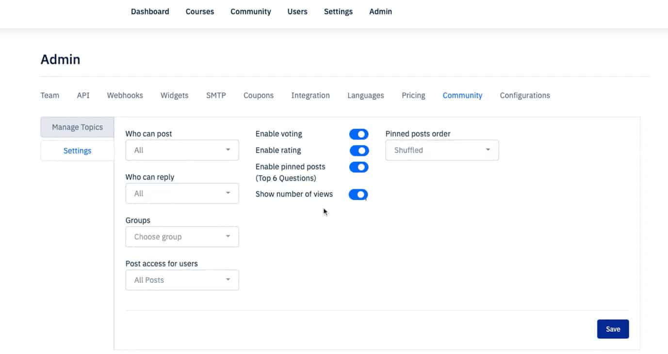 You can enable the Community feature from the Configurations tab. It helps you create a variety of topics, for example, Blog, Q&A, Feedbacks, Ideas, etc.
