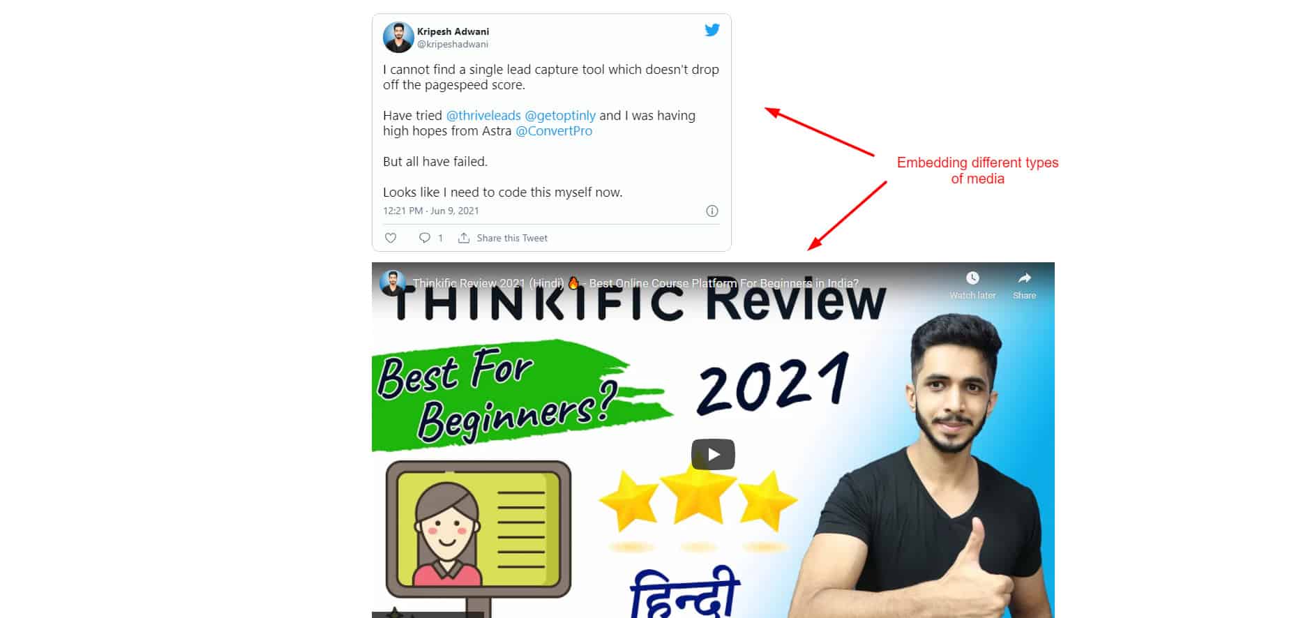 I tried to embed my YouTube video, a twitter post, a Vimeo video and a track from SoundCloud in my lesson. All of them were embedded successfully!
