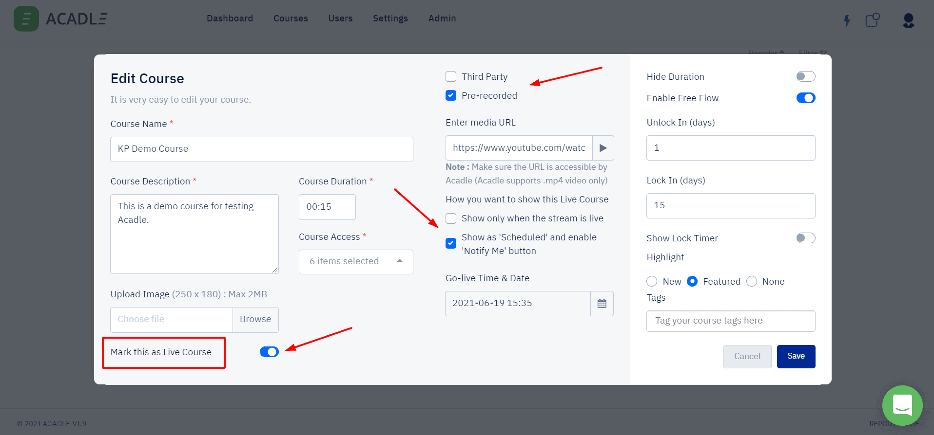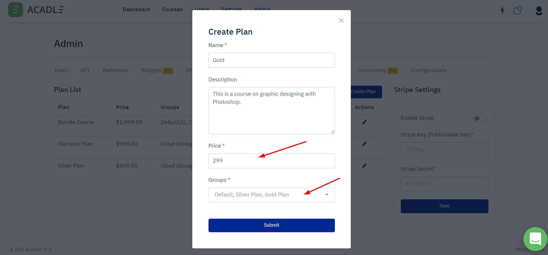 Acadle lets us create unlimited courses with unlimited lessons. While creating a new course, you can set the duration of your course and even assign it to a user group if you only want it to be available to specific students.