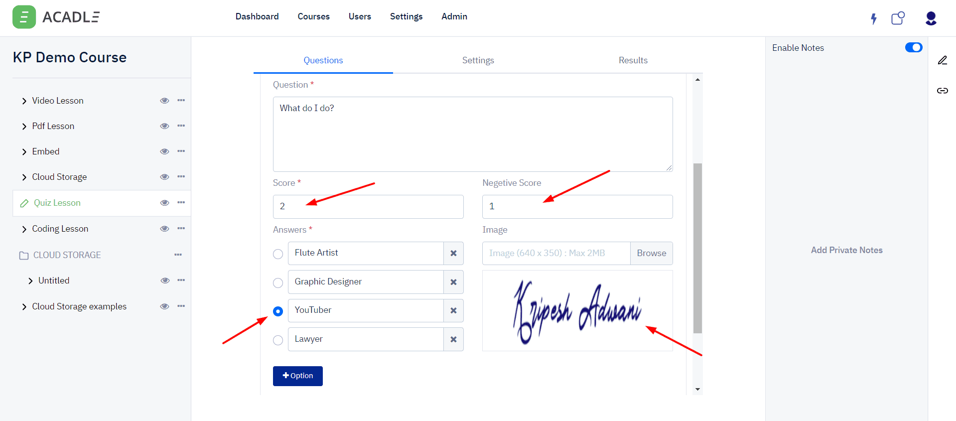 If you regularly conduct tests and quiz sessions with your students, you would love the advanced Quiz Lessons on Acadle. It lets you create customized quizzes with loads of features!
