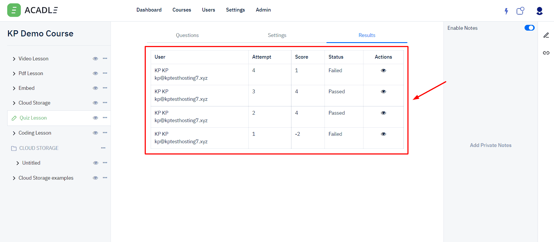 The results of the quizzes, along with the status, score, and number of attempts, can be viewed in the Results tab.