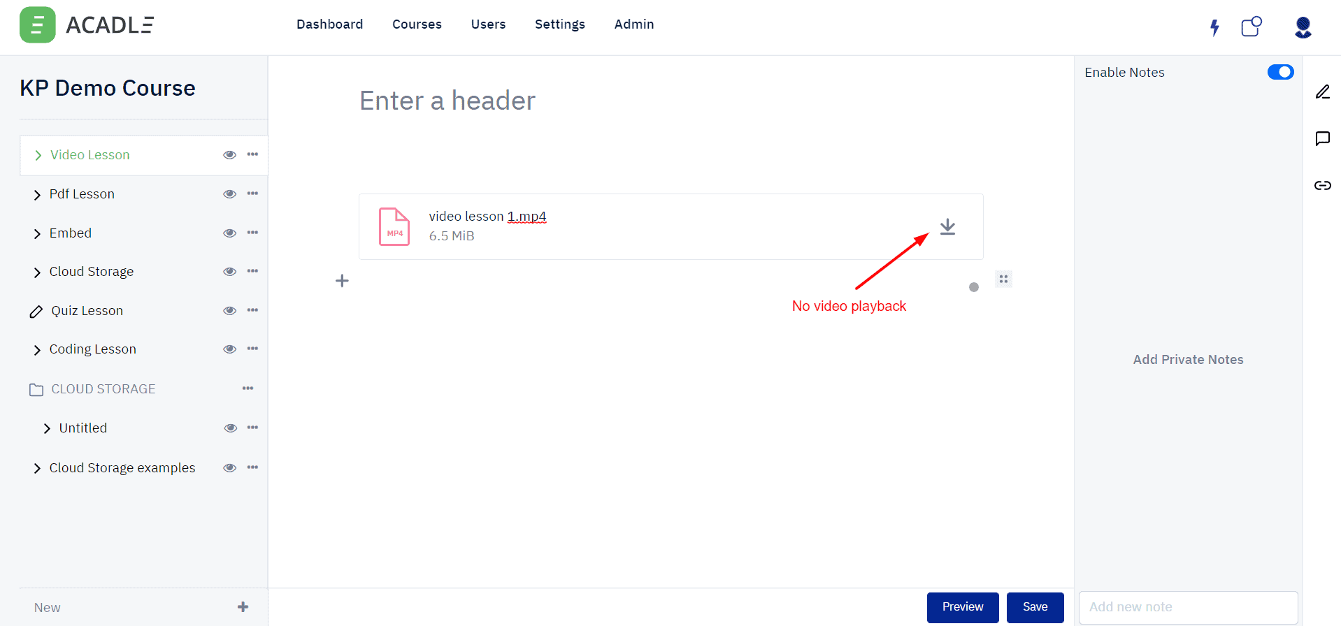 You need to download videos for viewing them. Acadle does not support video playbacks. However, you can embed YouTube links effortlessly!