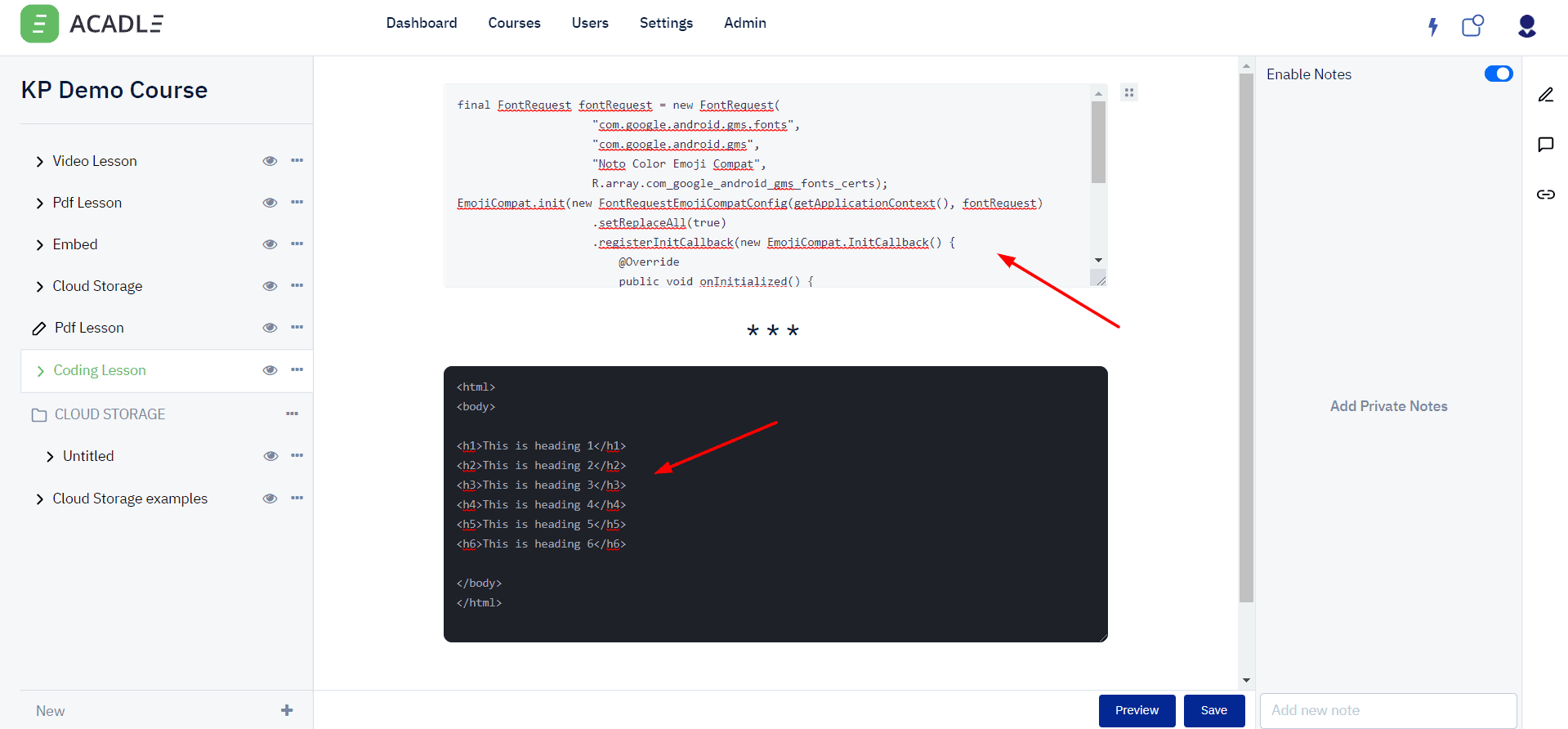 Acadle offers coding blocks, but does not support color coding according to the programming language used. This makes it a poor option for creating coding related courses.
