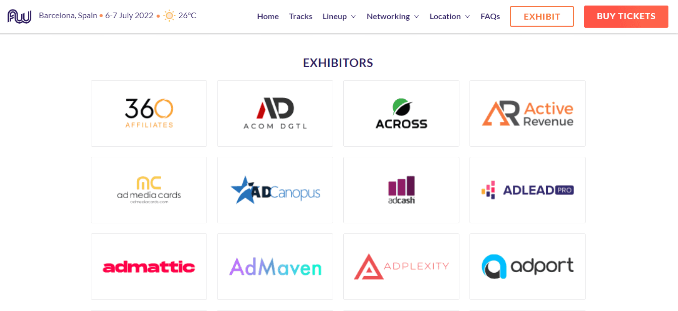The Affiliate World Barcelona will host 200+ exhibitors and 150+ affiliate networks. This includes renowned names in the industry like 360 Affiliates, Thrasio, Taboola, MGID, Empire Flippers, ClickBank, and many more.