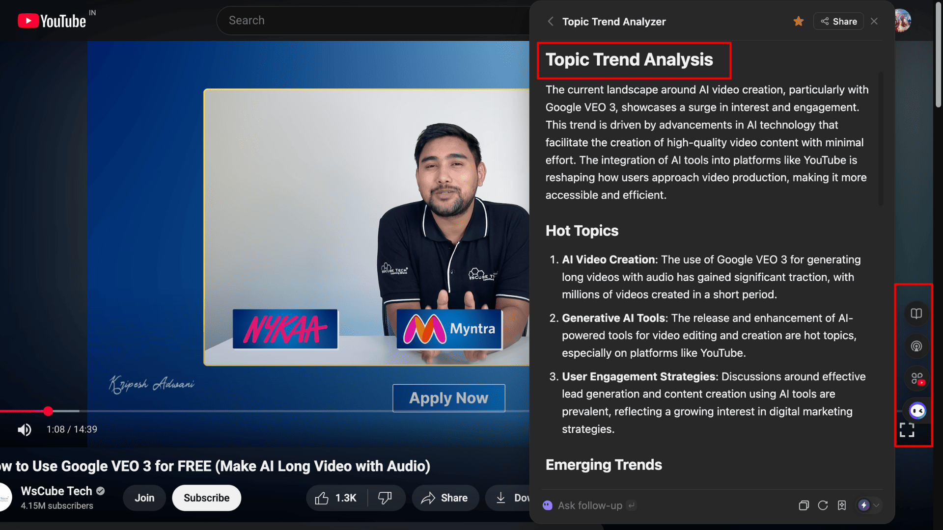 - Topic Trends Analyzer: If youāre a content creator, simply enter a topic or open a related YouTube video. Monica AI generates an in-depth report highlighting hot topics, emerging trends, key insights, and actionable recommendations based on the content.