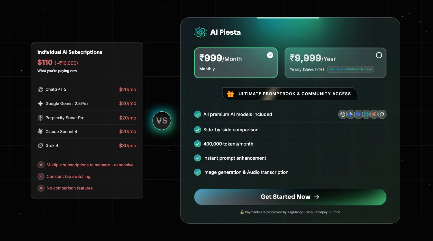 AI Fiesta brings all top AI models in one place with features like personal instructions, prompt enhancement, voice inputs, image generation, and even UPI support for Indian users.