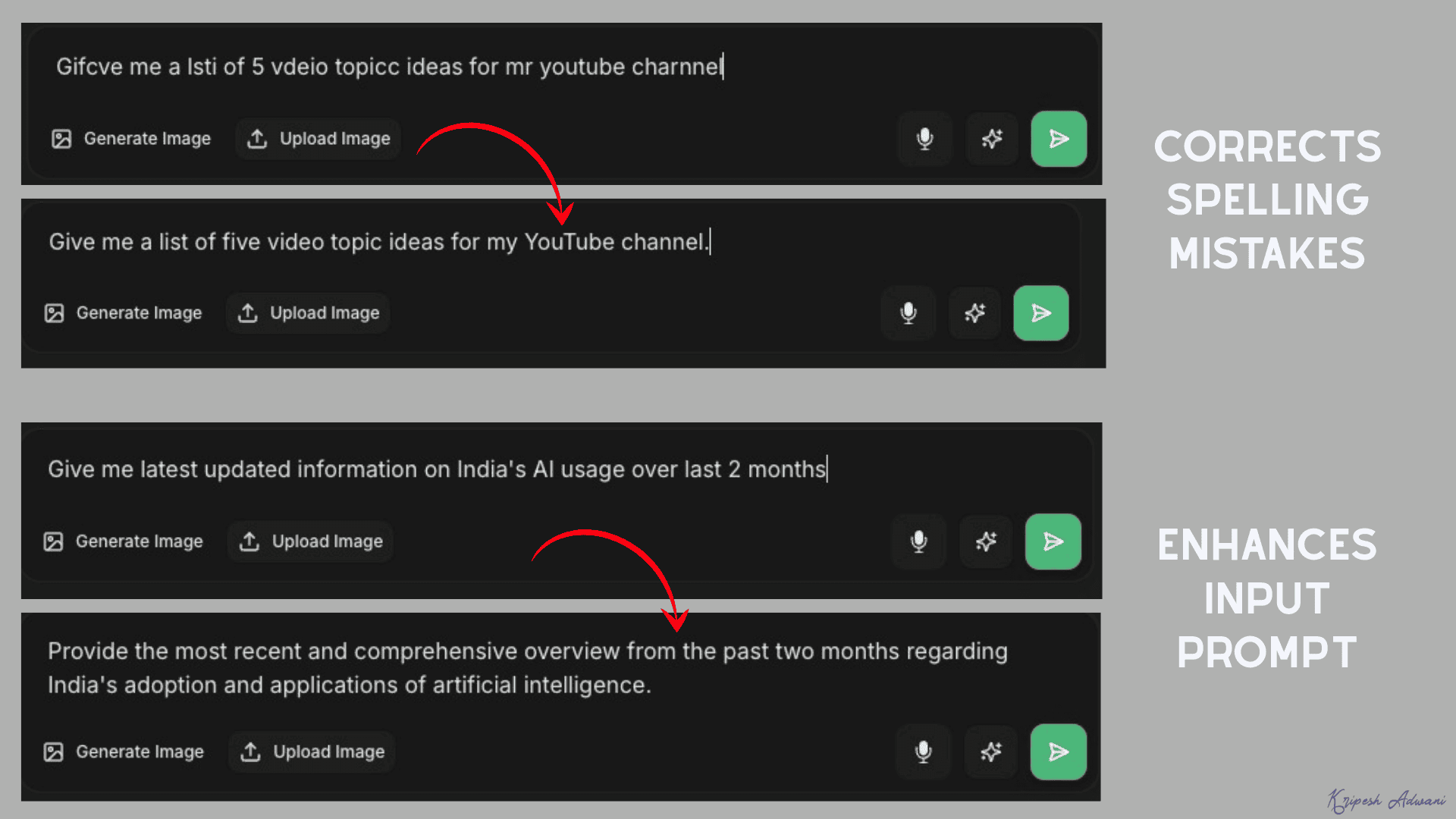 It will instantly correct your spelling or enhance the details in your prompt. This helps in getting better outputs from your input queries.