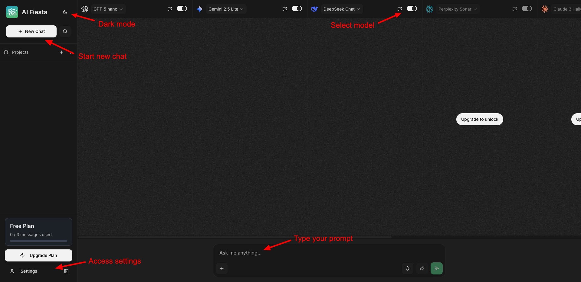 The UI of AI Fiesta looks friendly and easy to use, with a modern design and pleasing colors. From the left panel you can start a new chat, access settings, check your plan limits, and switch between light and dark modes.