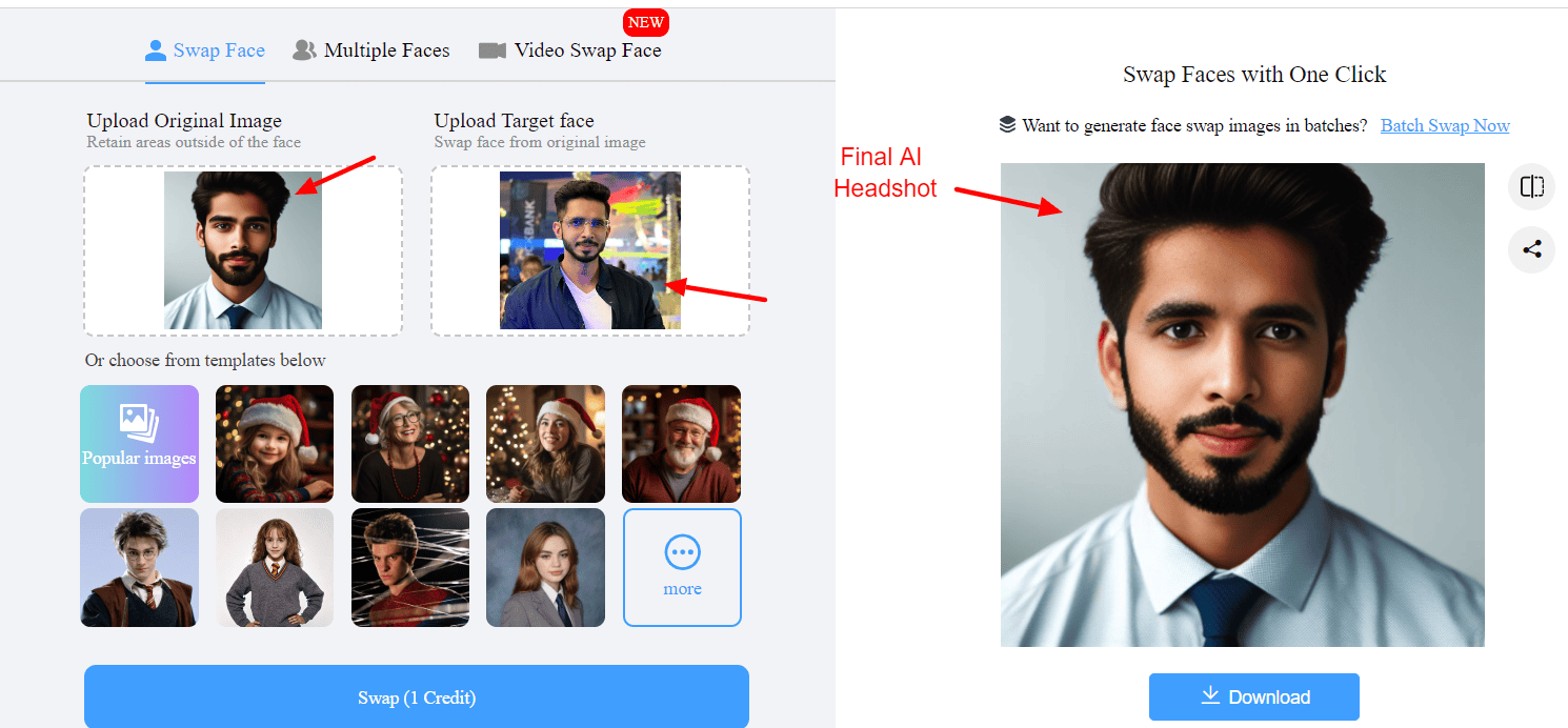 Make sure your face is clearly visible in the image. Within a few seconds, the AI face will be swapped with yours!