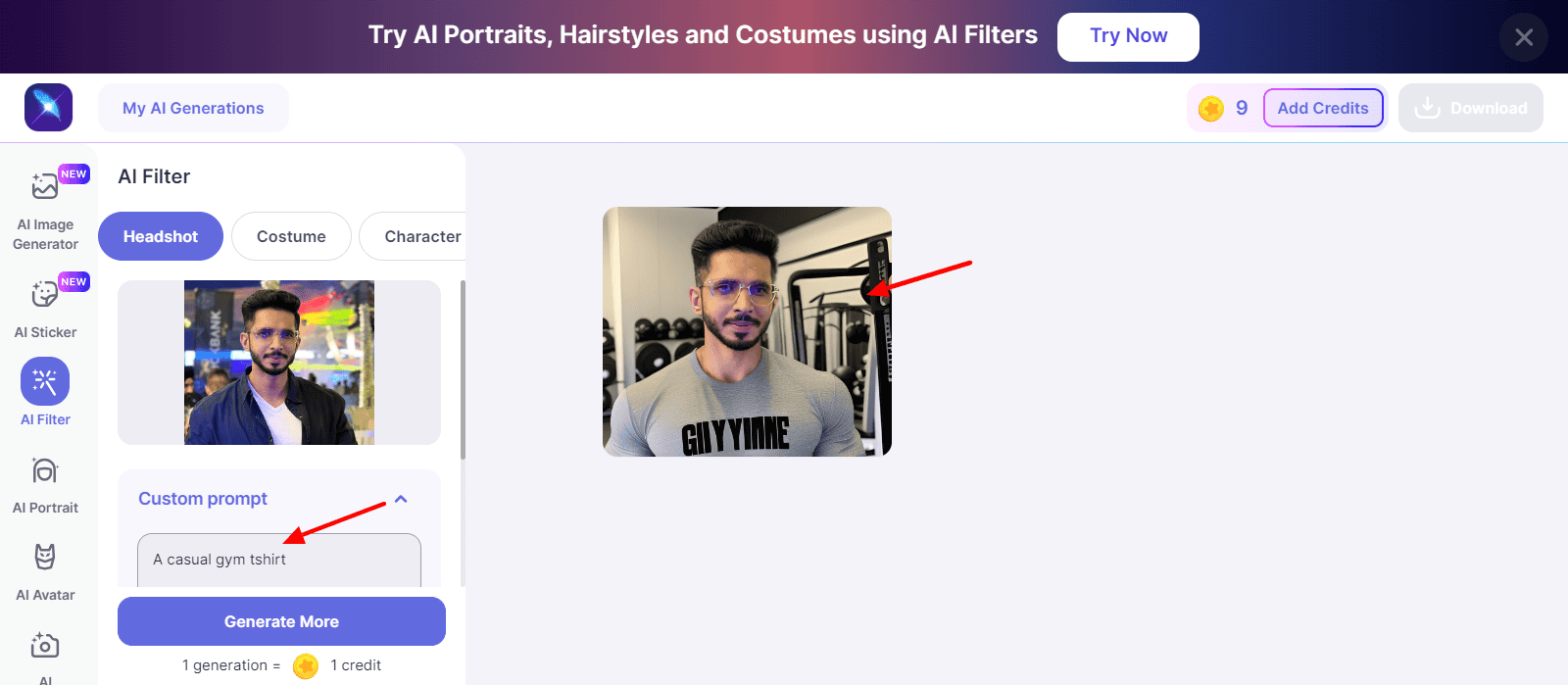Here’s an imge generated via a custom prompt where I wanted a headshot in a casual gym tshirt. Next, I tried generating an AI headshot via style. This is how it looks!