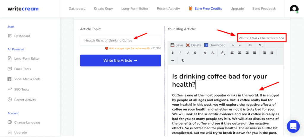 The Long-form Editor of Wordplay generates superb content. It can generate over 2k+ words with a single click!