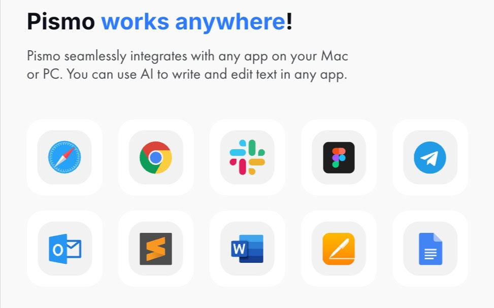 Pismo is available as a desktop application. It works with popular software like browsers, word processors, email clients, etc, to enhance your productivity.
