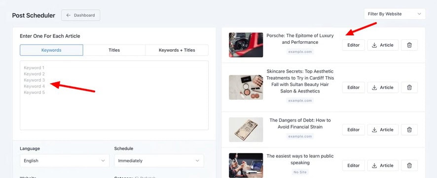 Wordplay offers a WordPress plugin that can directly input your generated content into your WordPress website. You can also schedule and publish your blog content with it.