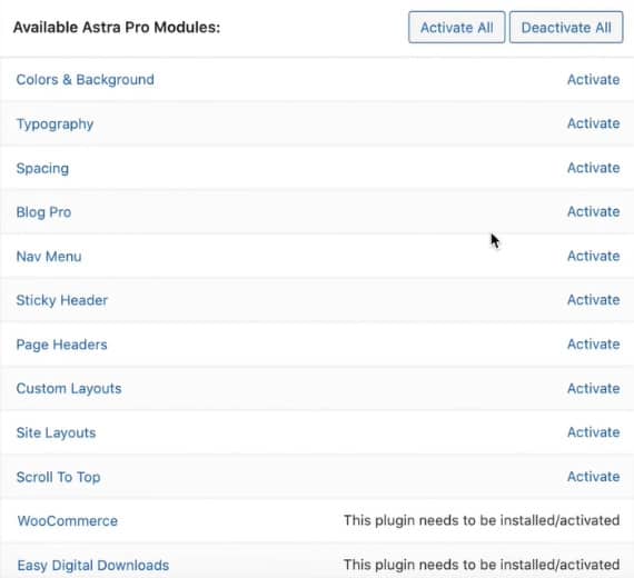 After clicking on the Appearance tab, we’ll go to the Astra Options. Here, you can activate or deactivate the available pro modules.