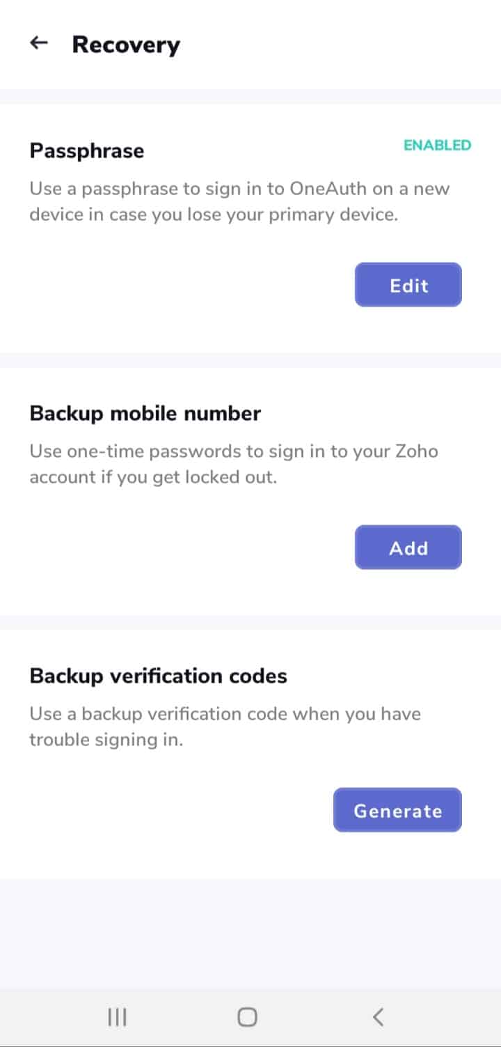 In case you lose your mobile or switch to a new one, Zoho OneAuth app provides multiple options to recover your account.