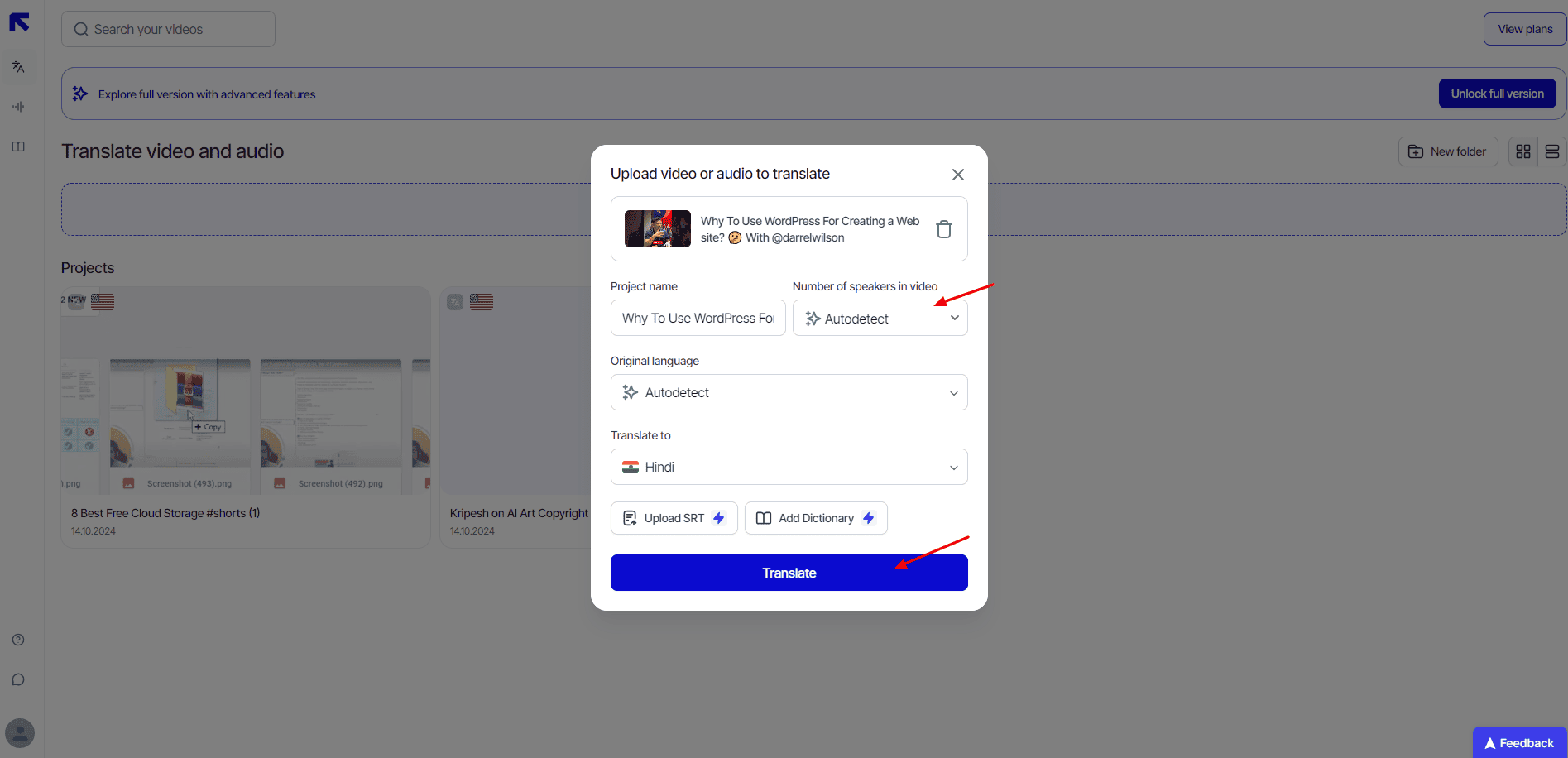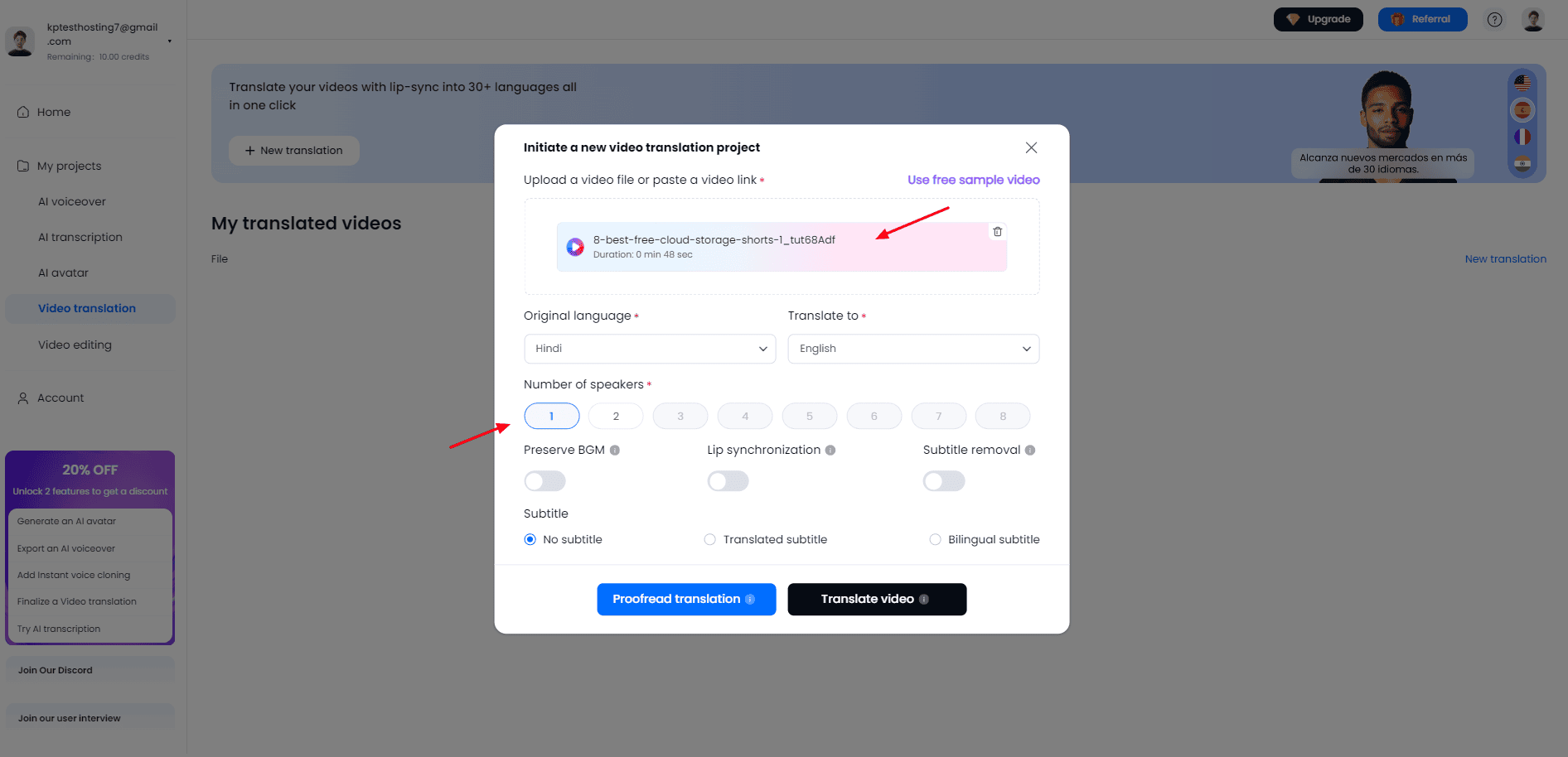 It lets you select the number of speakers, and choose if you want translated subtitles, bilingual subtitles, or don’t want subtitles at all. Additionally, you can enable or disable options like preserving BGM, lip synchronization, and subtitle removal.