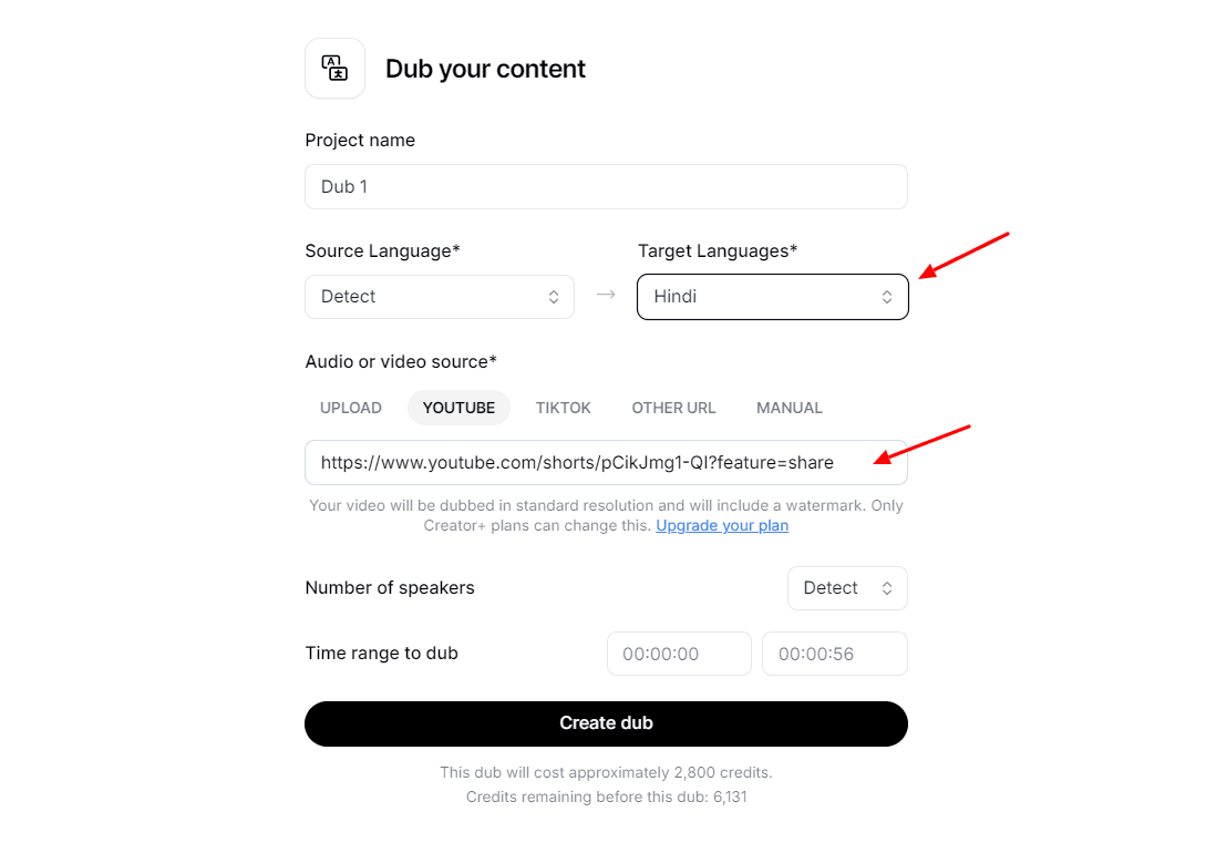 To dub your video, you need to first upload a link to your source content or upload your audio track. Next, you can pick a target language, select a time range for dubbing, and the number of speakers involved. It can also auto-detect the speakers and source language.