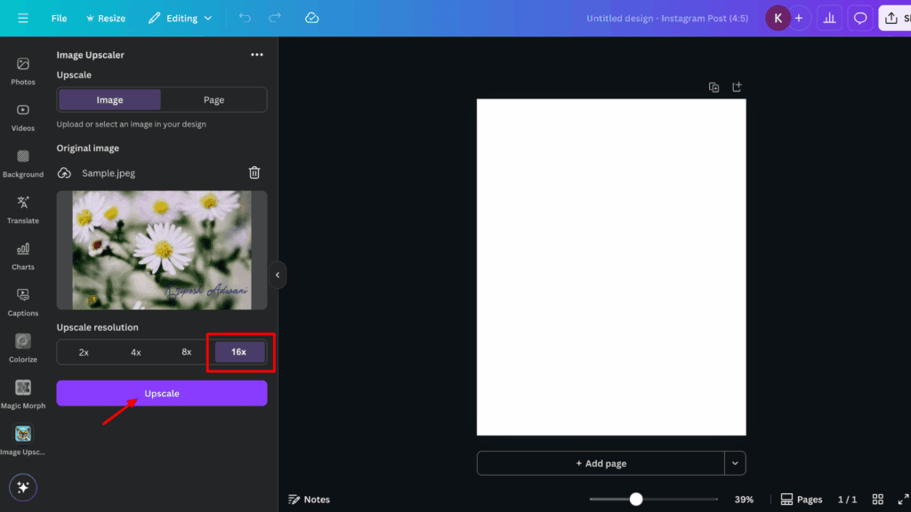 The Image Upscaler feature is powered by A1D AI and allows you to upscale images from 2X up to 16X. Simply visit the image upscaler, upload your photo, choose the desired resolution, and your enhanced image will be ready in seconds. Canva even lets you upscale an entire pageāperfect for presentation or design exports.