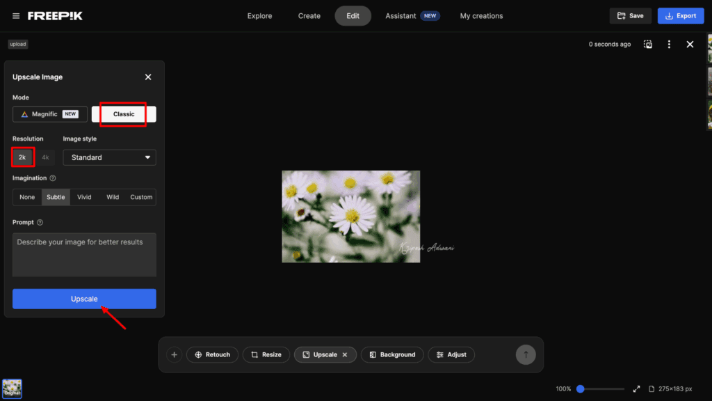 The upscaler offers two modes. Classic Mode (Free) supports 2K and 4K image upscaling with style options like Standard, Portrait, and Digital Art. Magnific Mode (Paid) offers advanced upscaling (2X, 4X, 8X, 16X) along with customization settings like HDR, image optimization, creativity levels, and resemblance adjustments.
