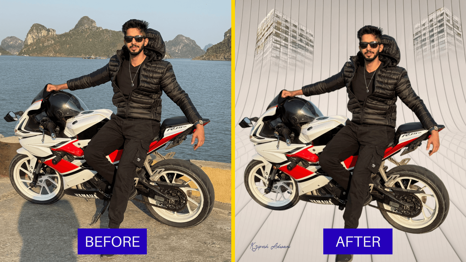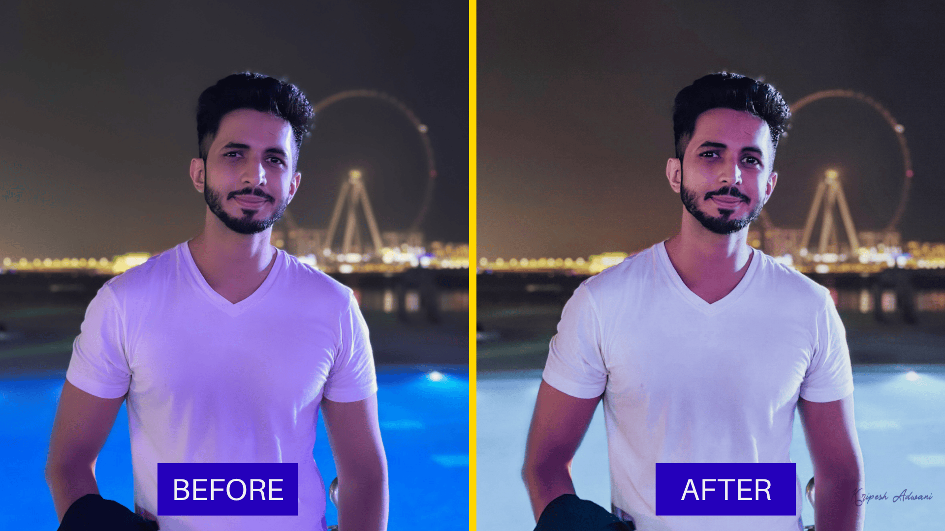 With a text prompt, you can add new elements to your photos. For instance, I replaced the Ferris wheel with a high-rise building in the background.