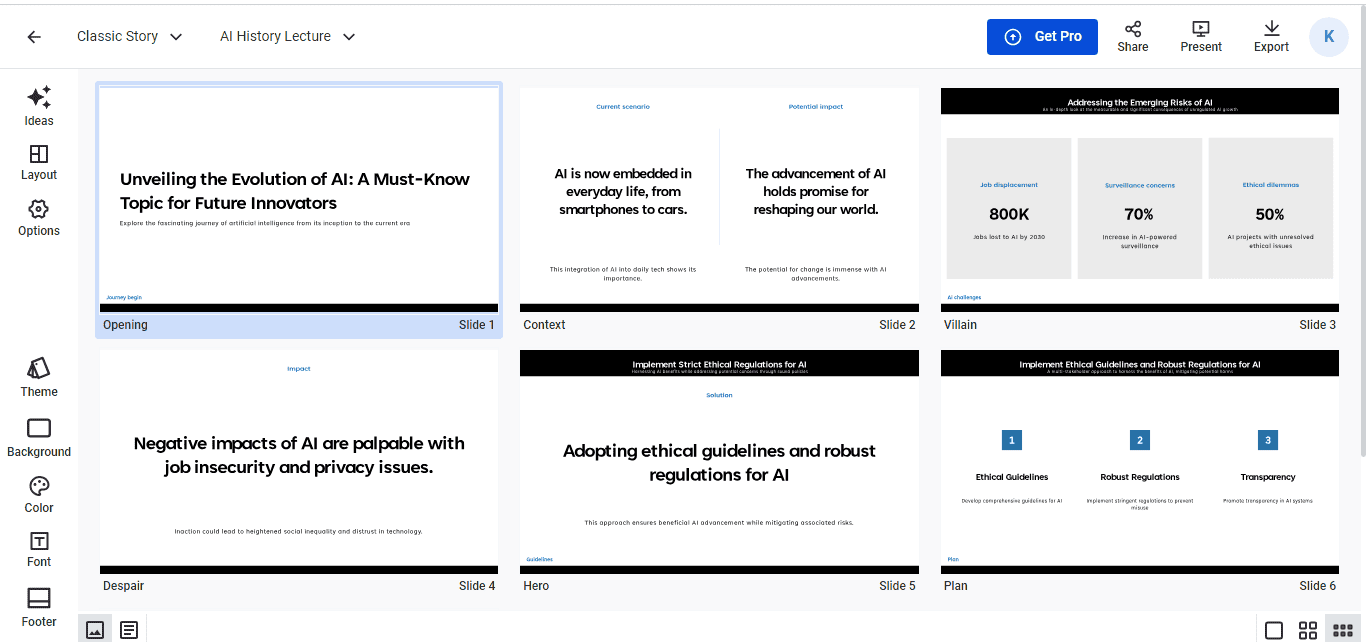What truly impressed me was the exceptional quality of the content. The outline covers the origin of AI, fundamental concepts, milestone advancements, challenges, ethical considerations, and more. The tool has embedded the presentation with relevant professional themes and images. The presentations even come pre-populated with timelines, charts, and tables, saving you even more time.