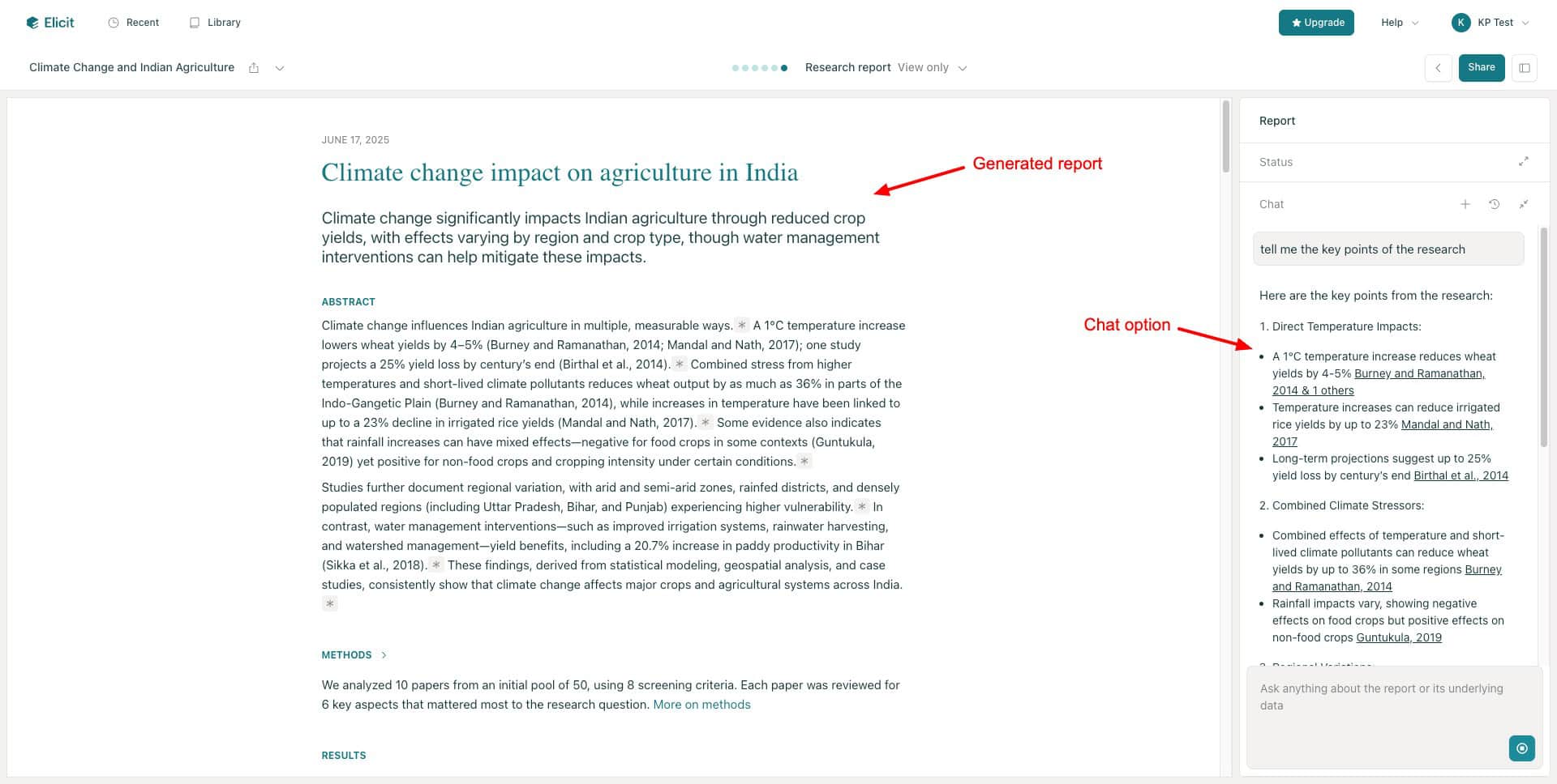 Another key feature of Elicit is generating research reports. Simply enter your research query, and the AI screens the top 50 papers and extracts relevant data from them. It then generates a comprehensive report. Then you can chat with it to clarify concepts or extract information.