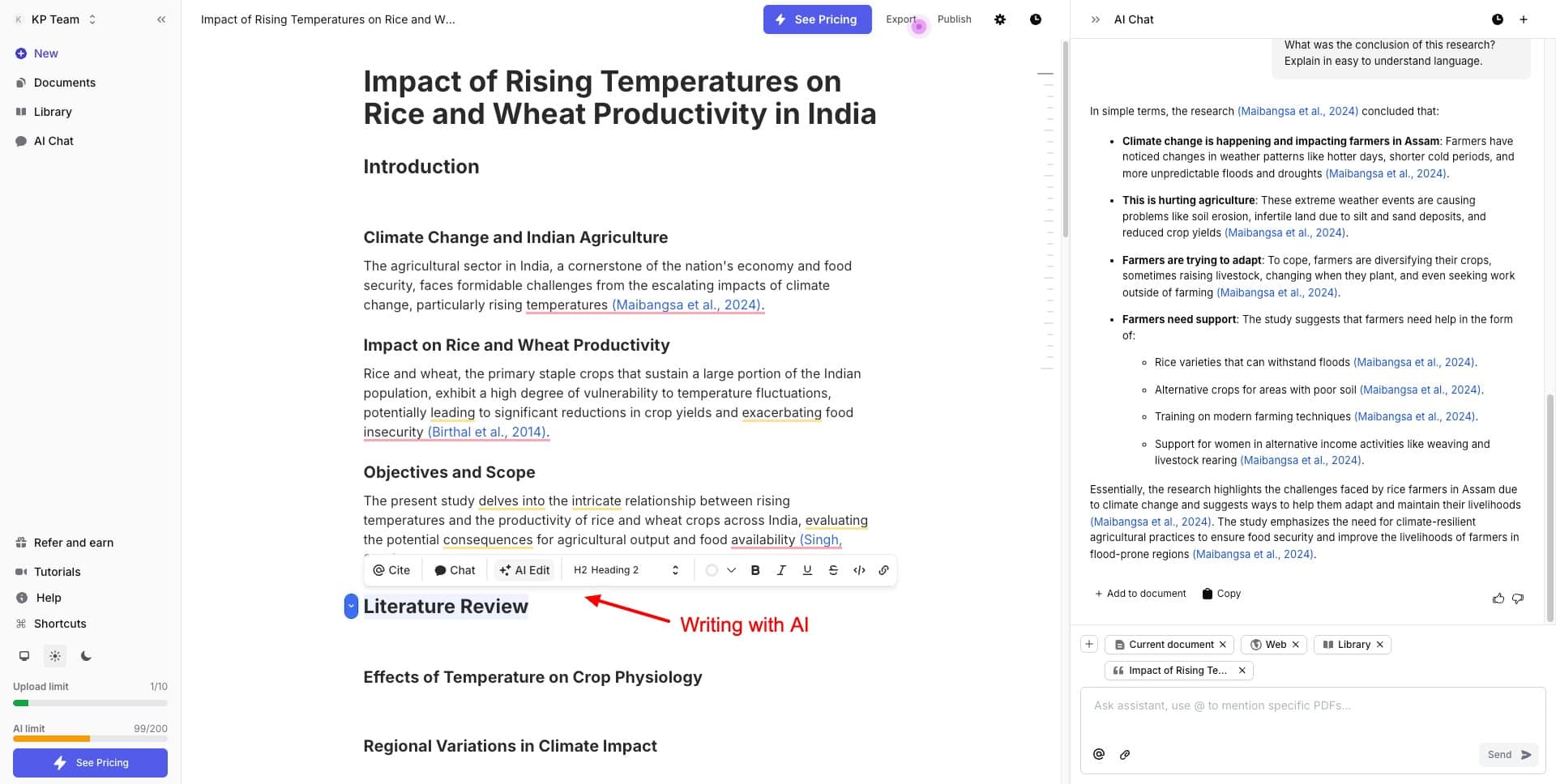 Pricing: Paperpal’s free plan offers 5 daily uses of its writing features, research Q&A, and limited chat with PDFs. You also get 200 language editing suggestions/month and 7000 words/month of plagiarism checks. Its paid plan with unlimited usage can be availed for $11.50/month.