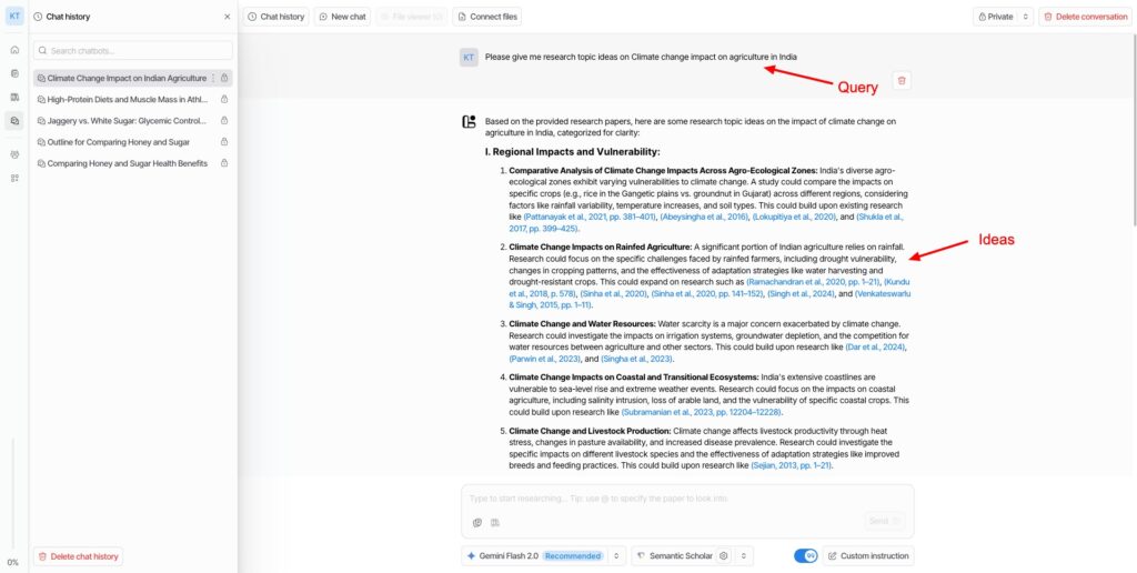 To get started, you can go to its AI chat assistant and request research ideas on your desired topic. It offers 3 modes: