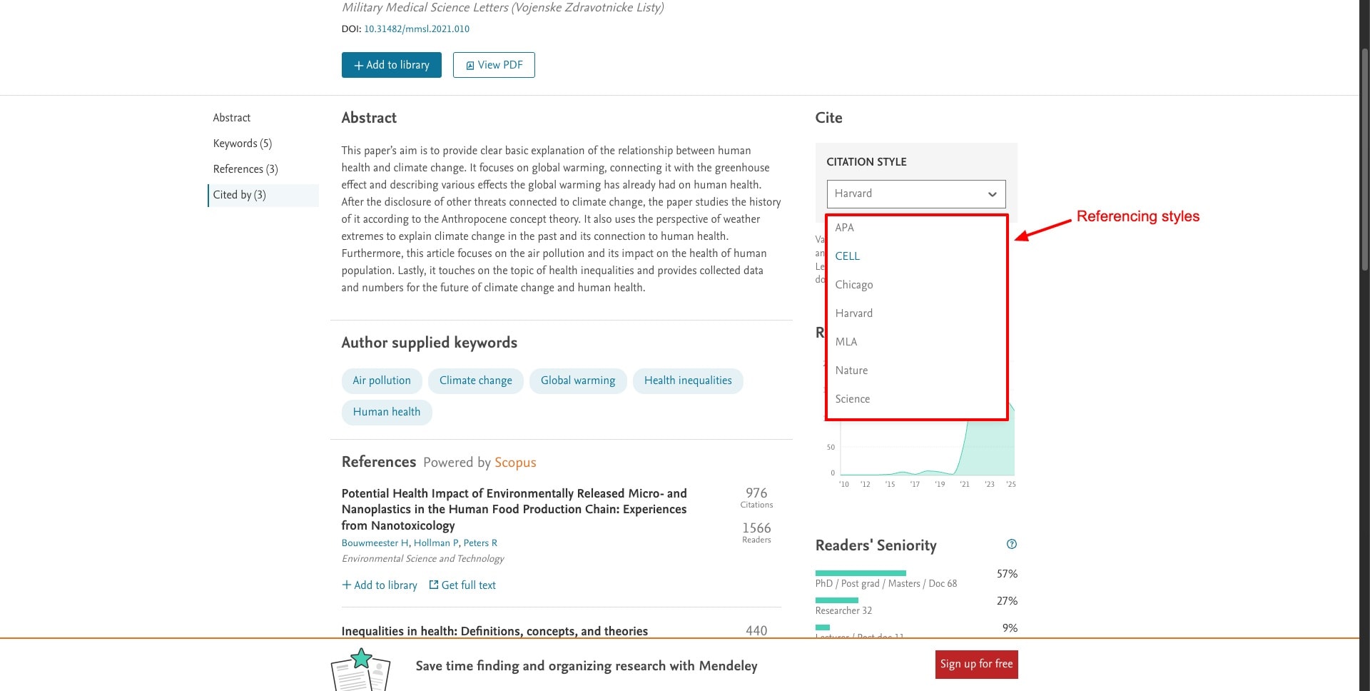 If you find any article that you wish to cite in your research, use the “Add to Library” button to build your database. It also lets you generate citations in multiple styles, including APA,MLA, Chicago, Harvard, CELL, etc.