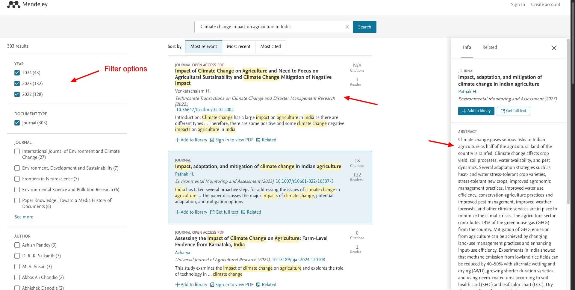 Along with the relevant research, you can also check the number of citations and readers on them. You can also filter the results by year, document type, journal, author, etc, or sort by most recent, most relevant, or most cited.