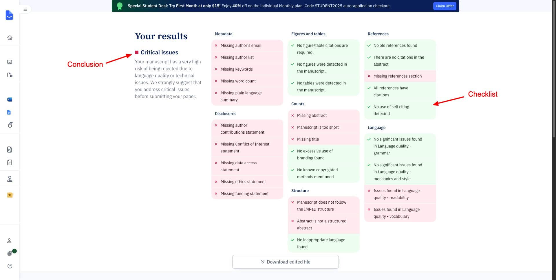 Another interesting feature is Submission Checker. You upload your paper, and the AI runs it through a checklist to confirm if it’s ready for submission. Then it highlights the action items in red and green colors and concludes whether your paper has more chances of acceptance or rejection.