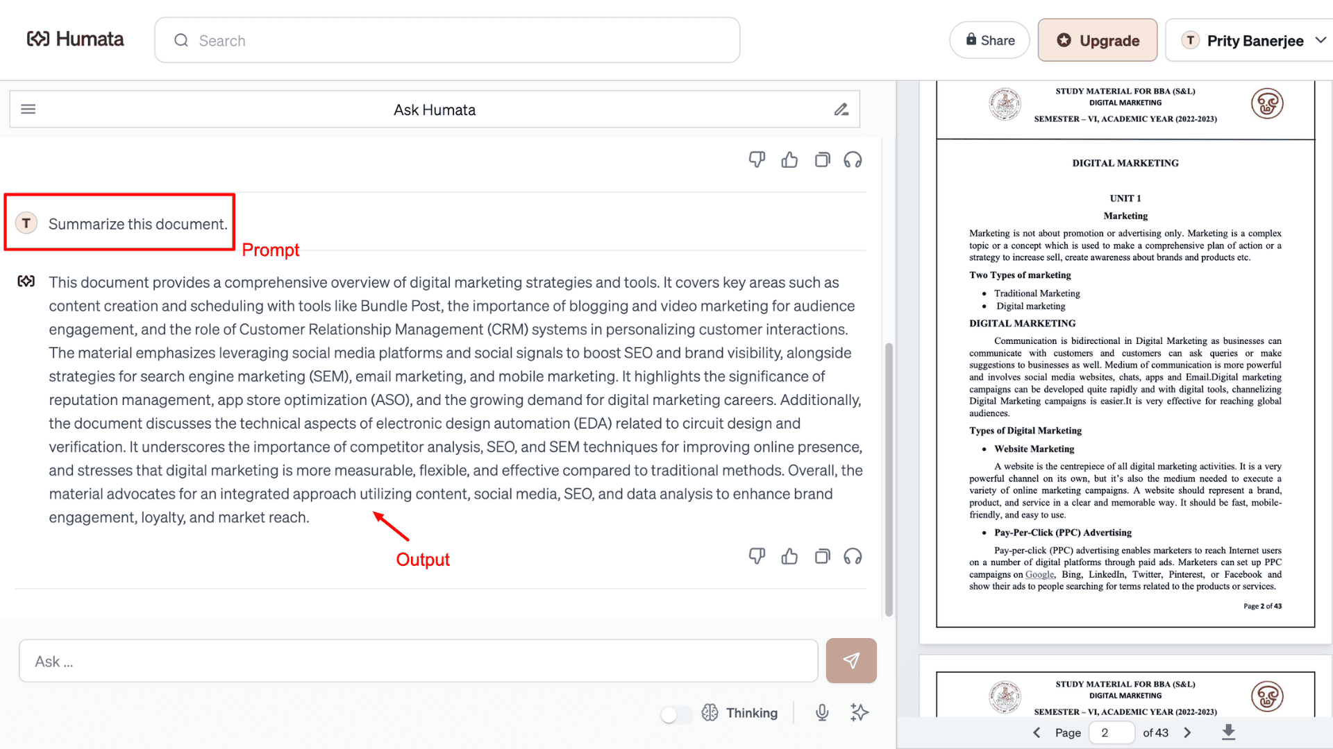 - Brief Summary: When you upload a file, Humata AI takes some time to process it. But then summarizes the key themes, similar to an executive summary.