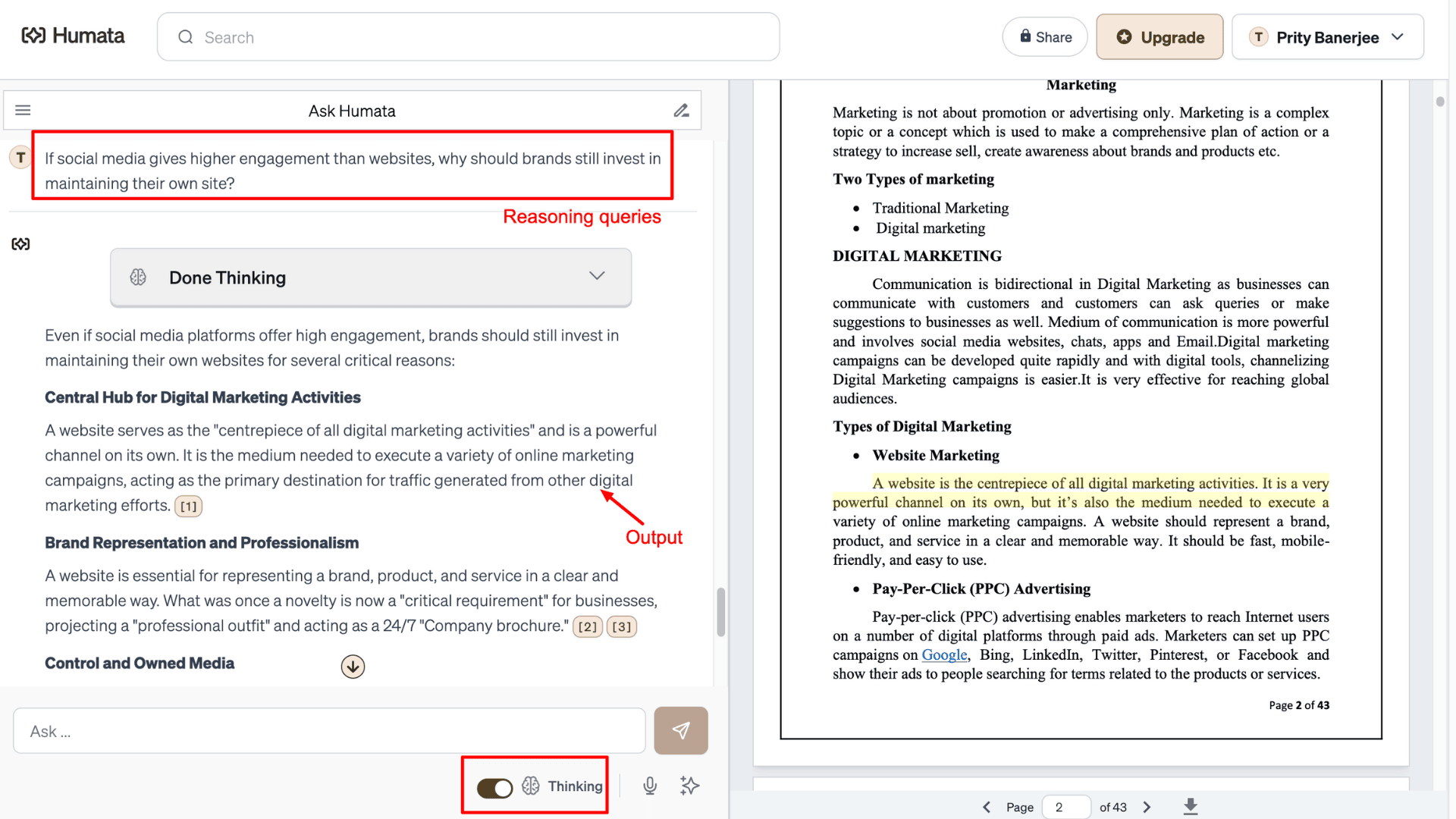 - Thinking Mode: For reasoning-based questions, you can enable Thinking Mode. For example, when I asked about the importance of website marketing in the era of social media (indirectly), it extracted relevant points from multiple chapters and presented a strong answer.