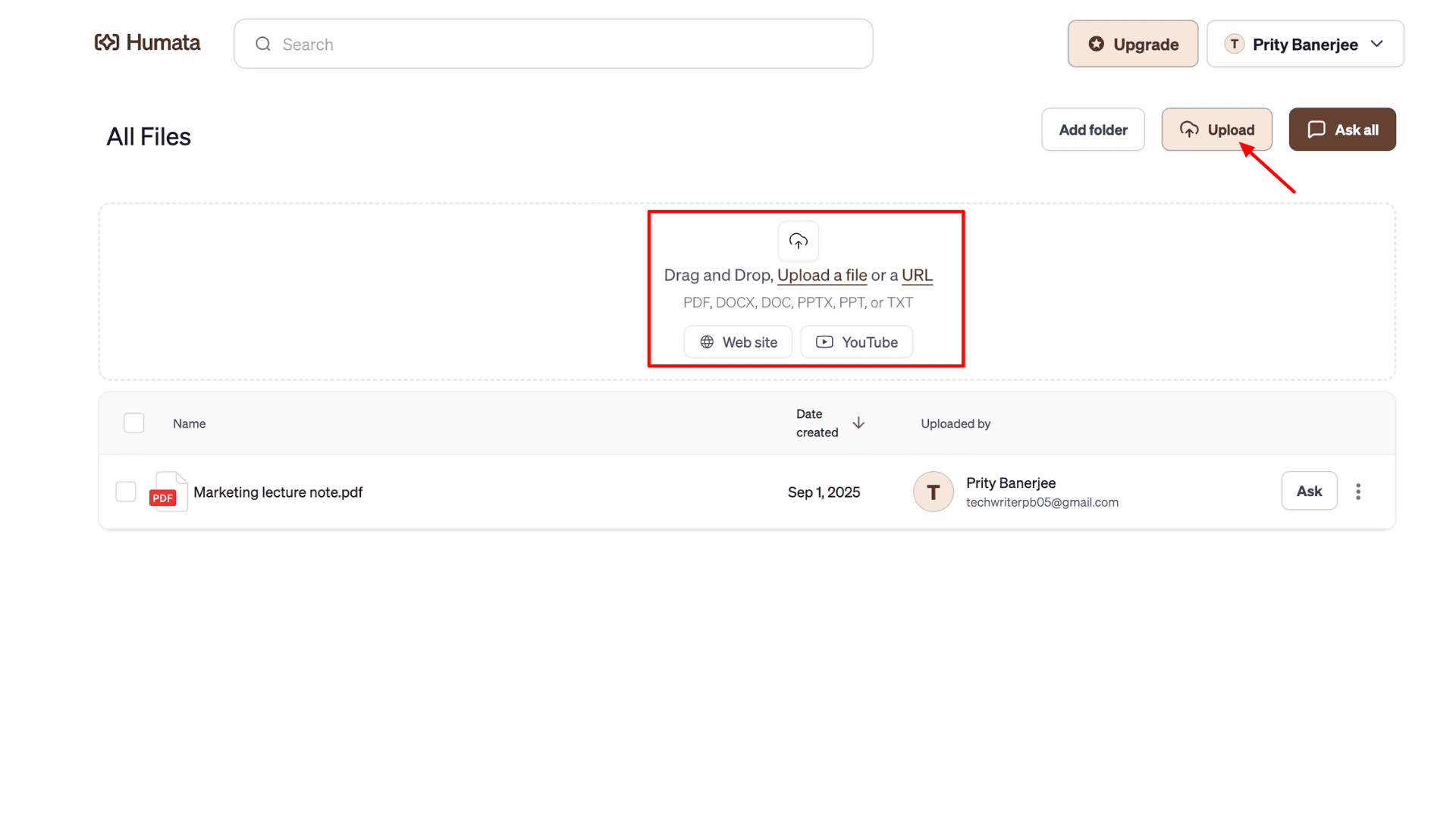 - Multiple File-Type Support: In addition to PDFs, Humata AI supports DOCX, DOC, PPTX, PPT, and TXT files. You can also add website and YouTube links to generate summaries or start a chat.
