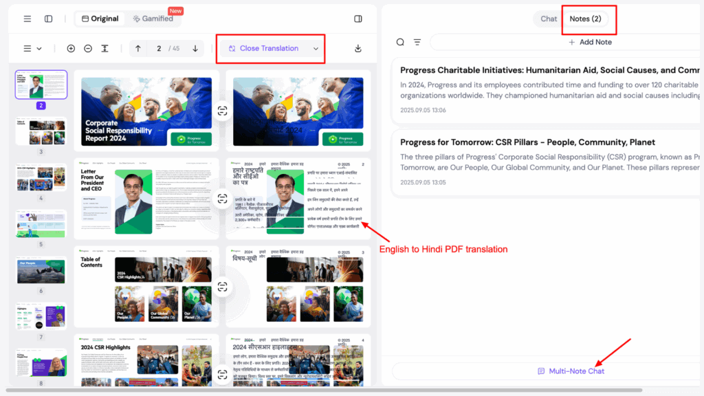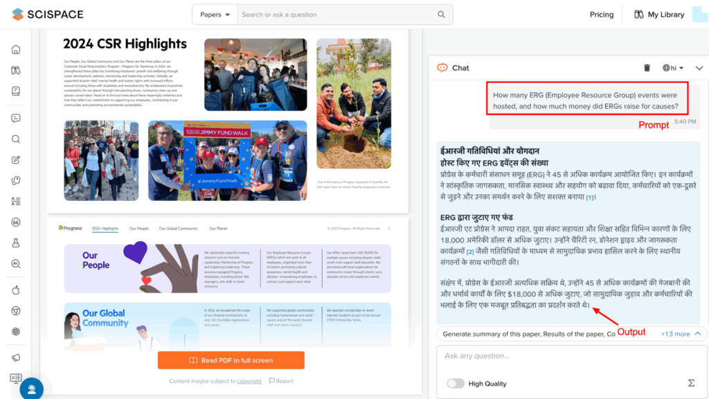 - PDF Translator: You can translate PDFs into different languages (Hindi, Chinese, Japanese, etc.) directly from the chat dashboard. For example, I translated a CSR report into Hindi, and it provided each slide with accurate Hindi translations.