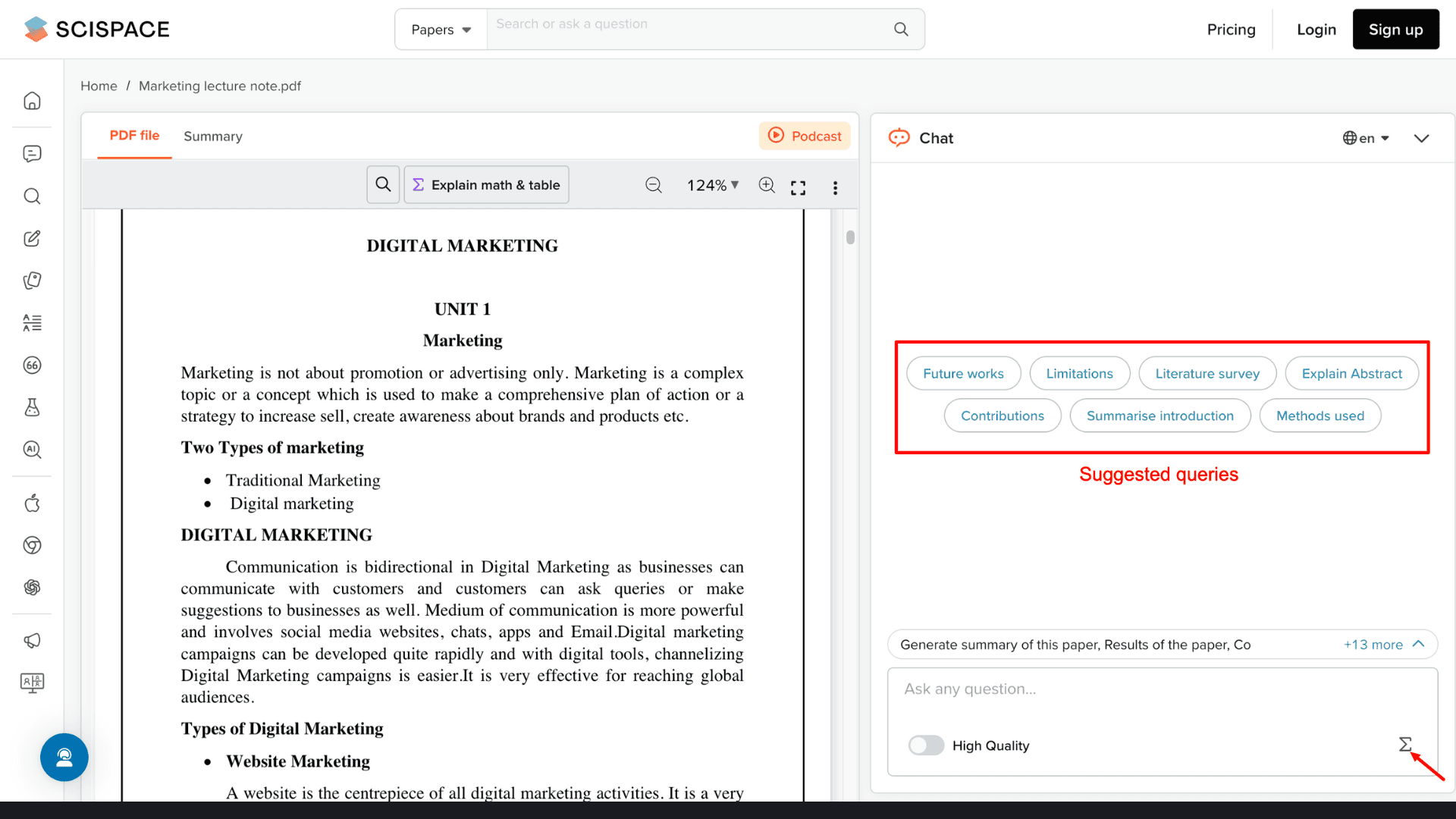 - Suggested Queries: Although SciSpace takes a little time to process PDFs, once uploaded, it generates suggested queries with pre-set prompts. This is helpful for students who want quick learning support.