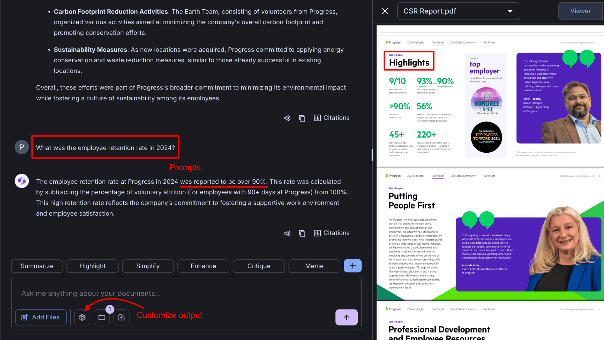 - References: Every answer is cited, and by clicking on a citation number, you can view the highlighted text within the original PDF.