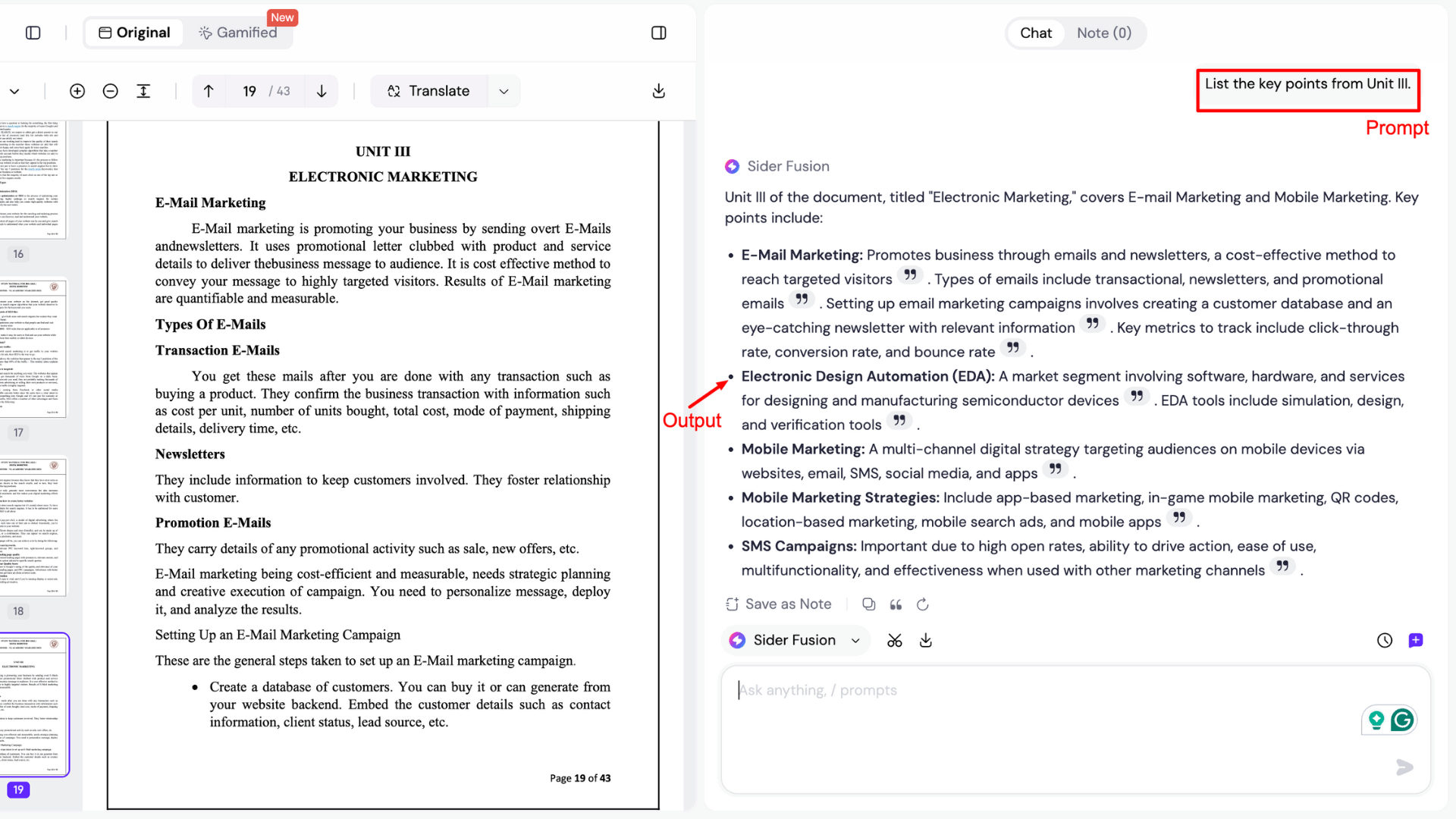 - Brief Summaries: The tool accurately detects chapters when extracting key terms (e.g., from Unit III). While it provided me with short, to-the-point answers for marketing documents, the output quality for technical documents was average.