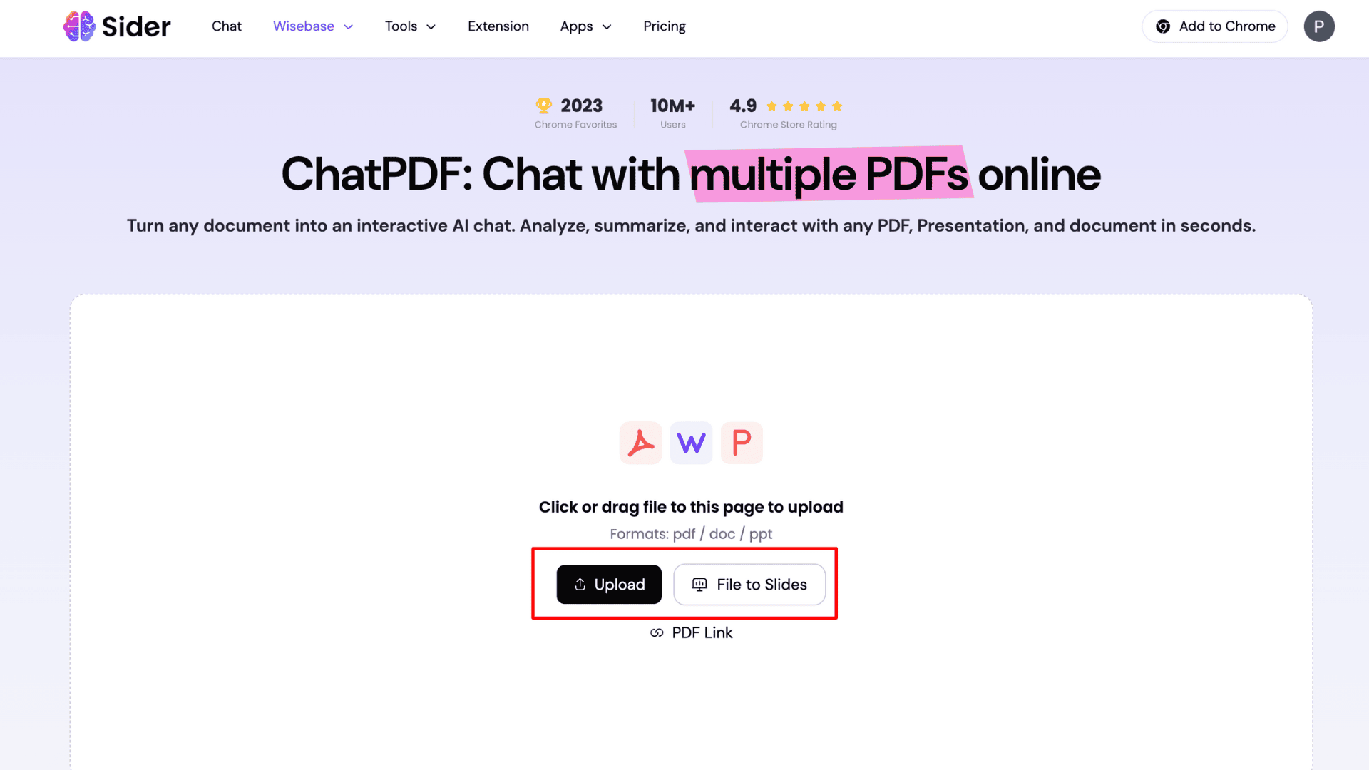 Sider AI is a popular app, ranked as a 2023 Chrome Favorite with a 4.9 rating on the Chrome Store. This app also provides ChatPDF features, letting you interact with, analyze, and summarize PDFs, documents, and presentations.