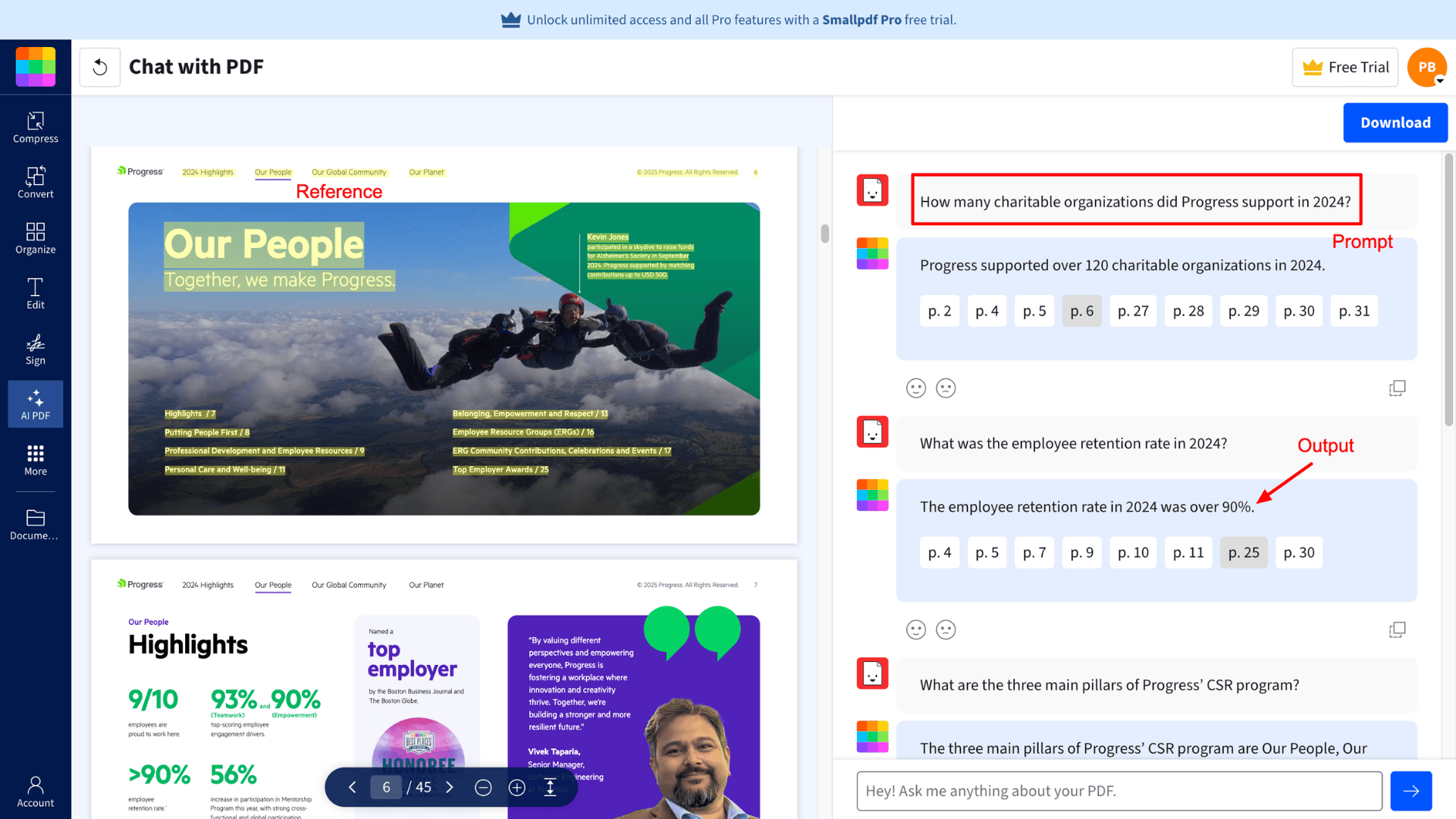 - Accurate Output: I tested SmallPDF with both academic and non-academic documents. It accurately analyzed each page and provided correct answers to both factual and general queries.