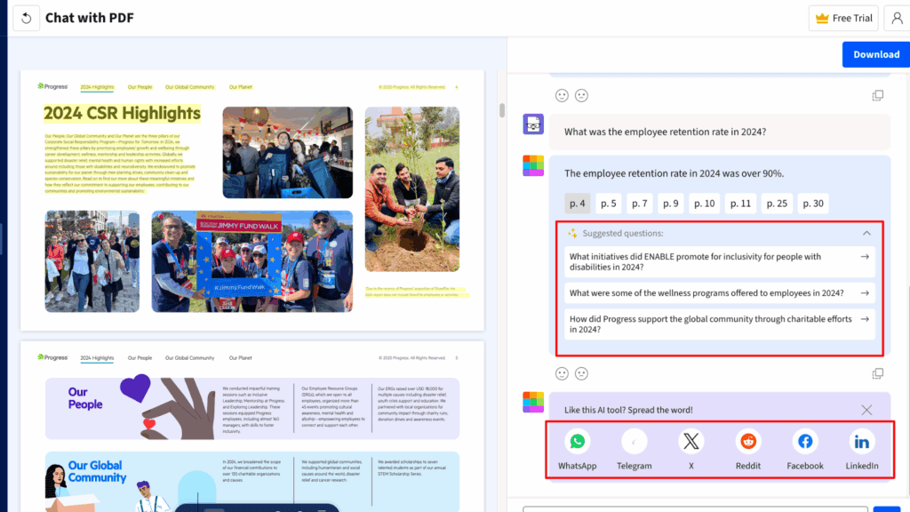 - Highly Accurate Answers: When I uploaded a CSR report and asked statistical questions, Sharly accurately responded with the exact employee retention rate and other figures.