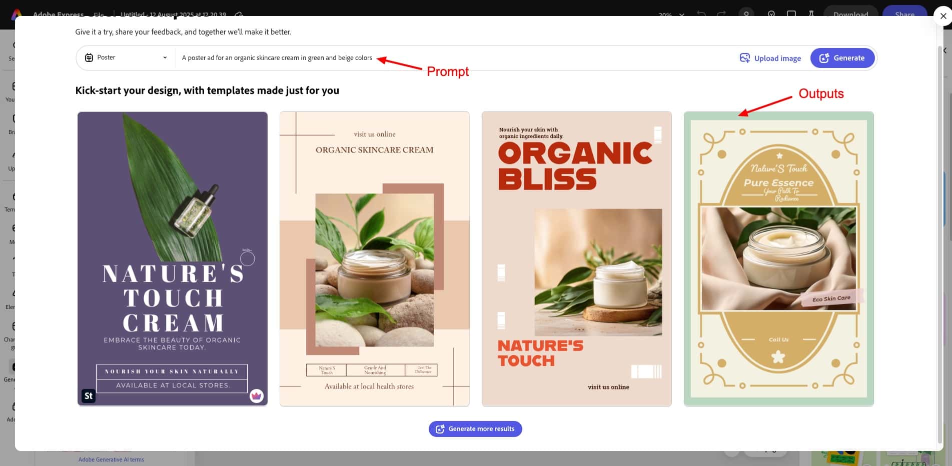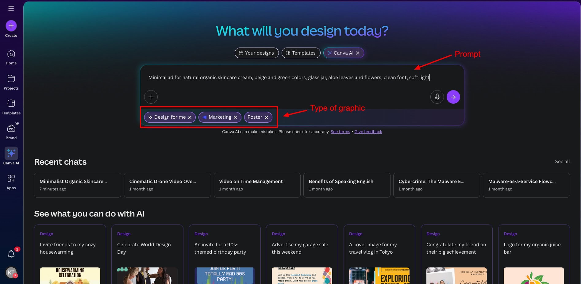 You can access its AI capabilities from the Canva AI tab. Select the ‘Design for me’ option and pick the type of design you wish to generate. Then, enter your prompt and see your design come to life within seconds! For instance, here’s an ad poster for an organic skincare cream.