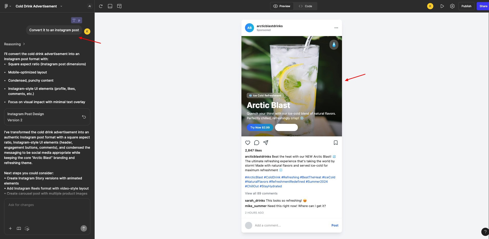 For instance, I tried to create an ad for a cold drink. It gave me a complete layout with image, text, relevant buttons, benefits, etc, like a web page. Then I asked it to convert the ad into an Instagram post, and it did so effortlessly within seconds.