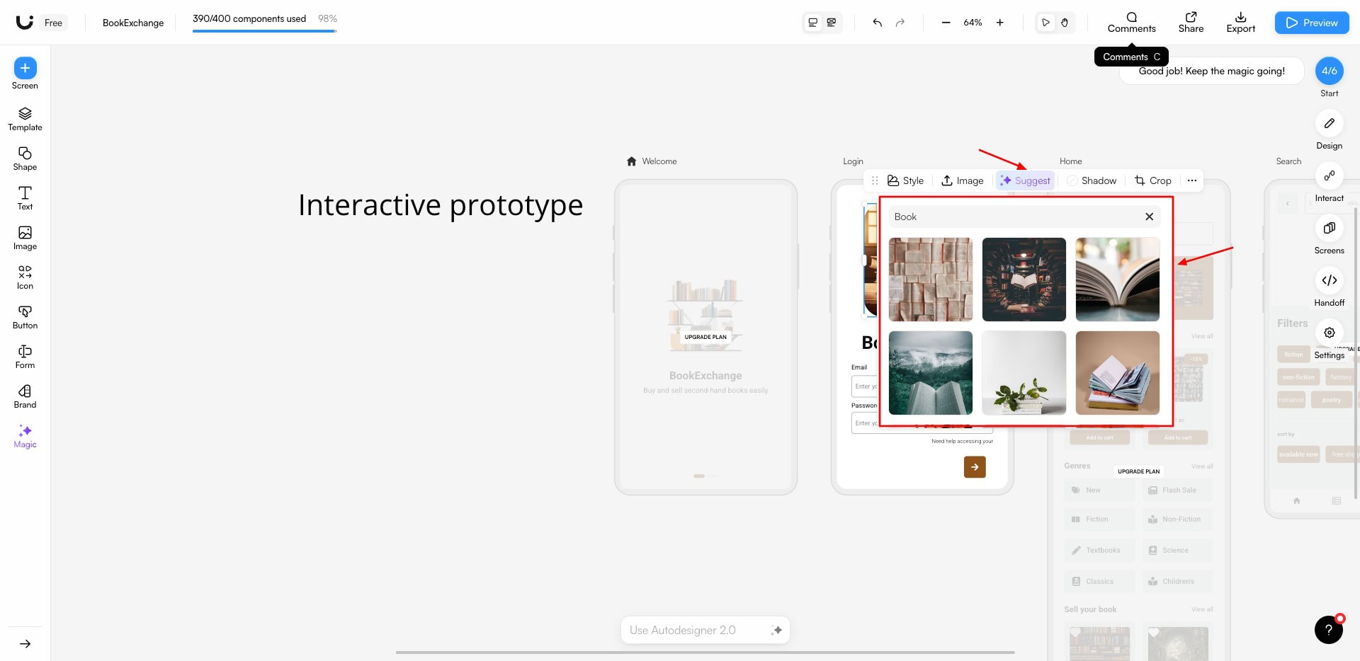 I tried to generate layouts for a book exchange app with a rustic brown theme. The results were quite impressive. Once the layouts were generated, it allowed me to make customizations like generating images, getting image suggestions, editing text, etc.