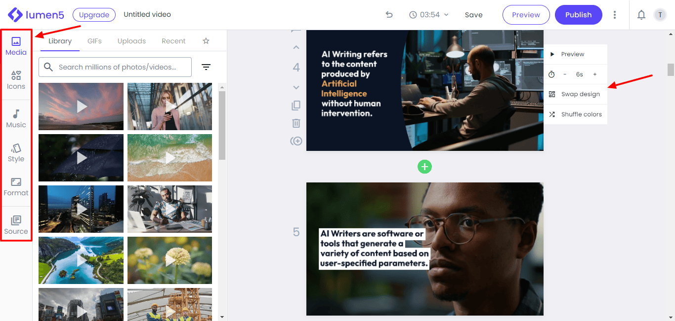 The AI-generated video slides incorporate AI-written content, designs, effects, and graphics. Lumen 5 also allows you to edit your videos. You can insert background music or voiceover into your track, or edit the typography, animation, etc.