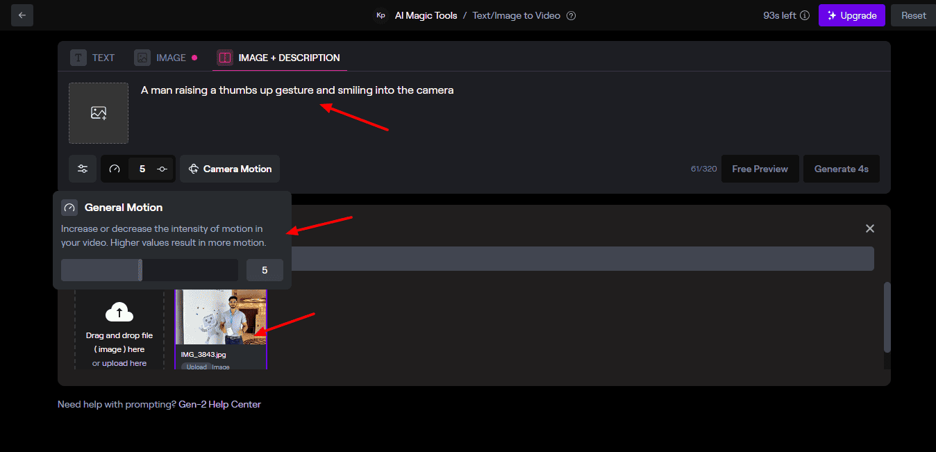 To get started, you can supply text, image, or image+description to create your video. It also features additional tools to set the intensity of motion and camera motion.