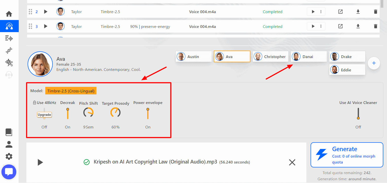 Once you pick the perfect AI voice, you get lots of customization options. You can adjust the pitch shift, age shift, gender shift, decreak, prosody, power, etc, to generate the perfect voice for your requirements.