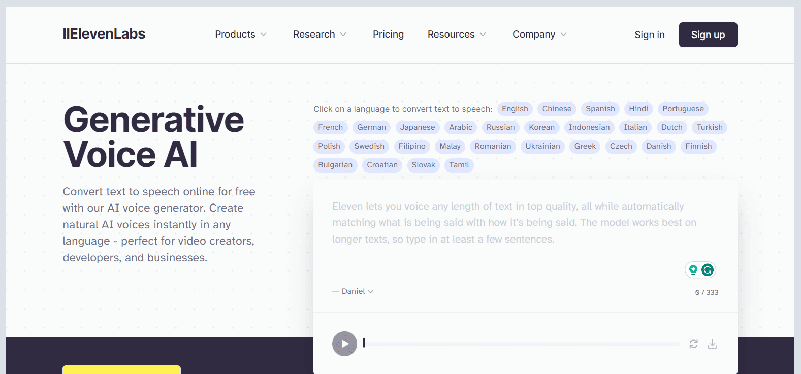 ElevenLabs is a popular AI voice generator. It works on deep learning technology that generates highly realistic voices. It features multiple AI voice models and an extensive library of 50+ pre-made voices and 10k+ community voices.